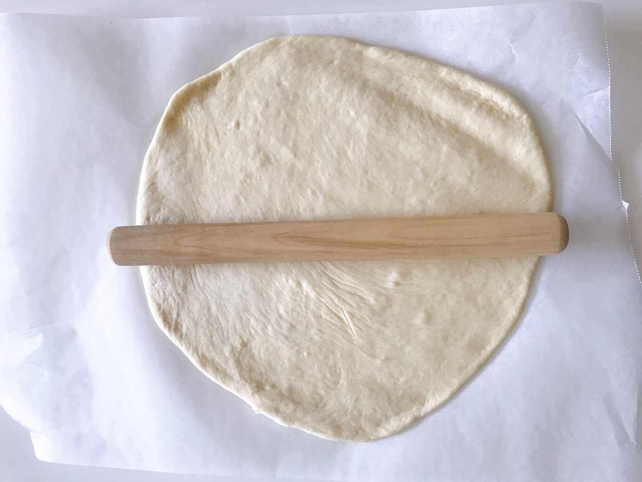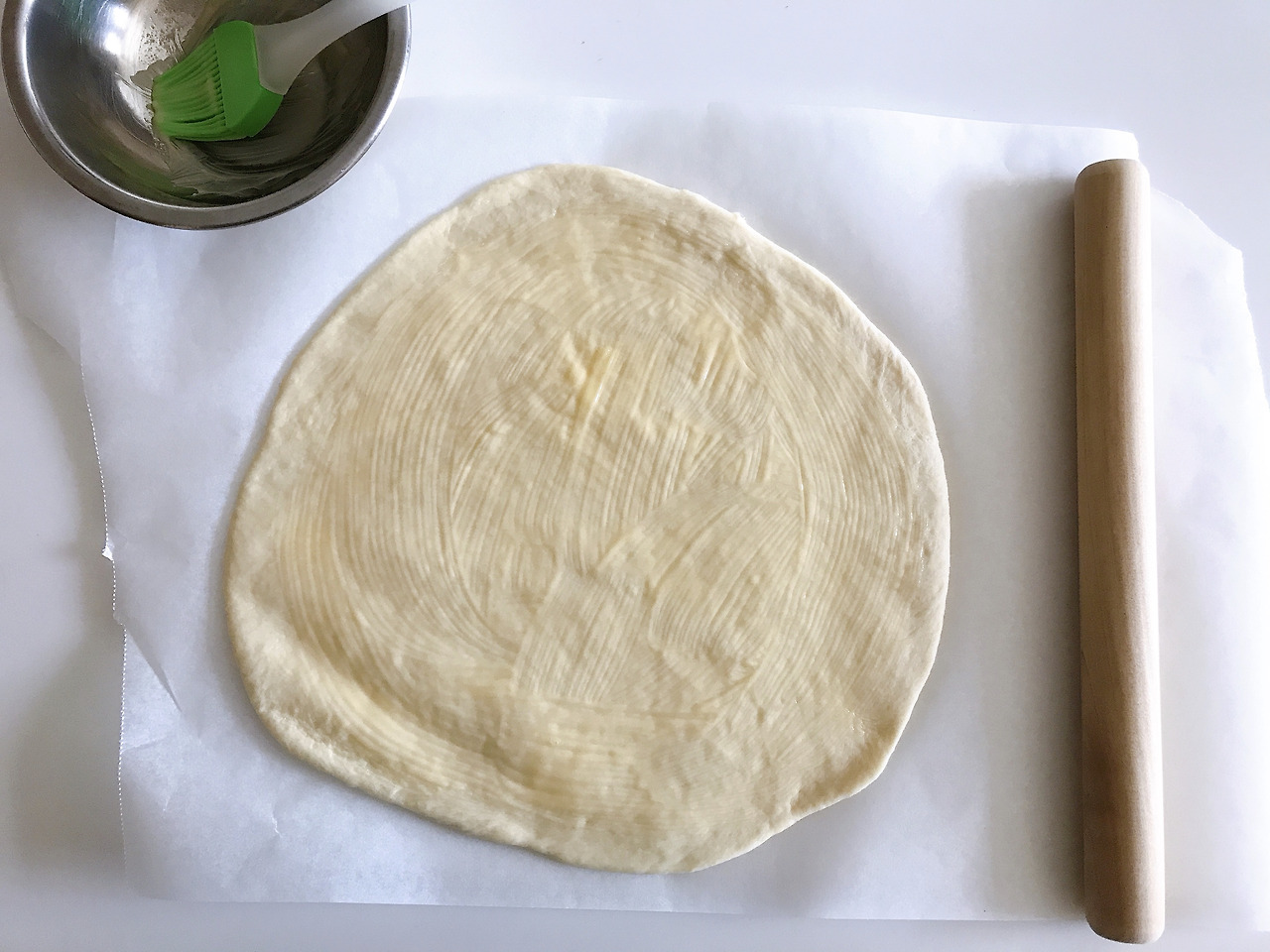 2. 1차 발효를 마친 반죽을 밀대로 얇게 밀어서 녹인 버터 10g을 얇게 펴 바른다. (가장자리를 2cm 정도 남겨둬야 나중에 반죽을 말아서 여밀 때 끝이 잘 붙는다.)