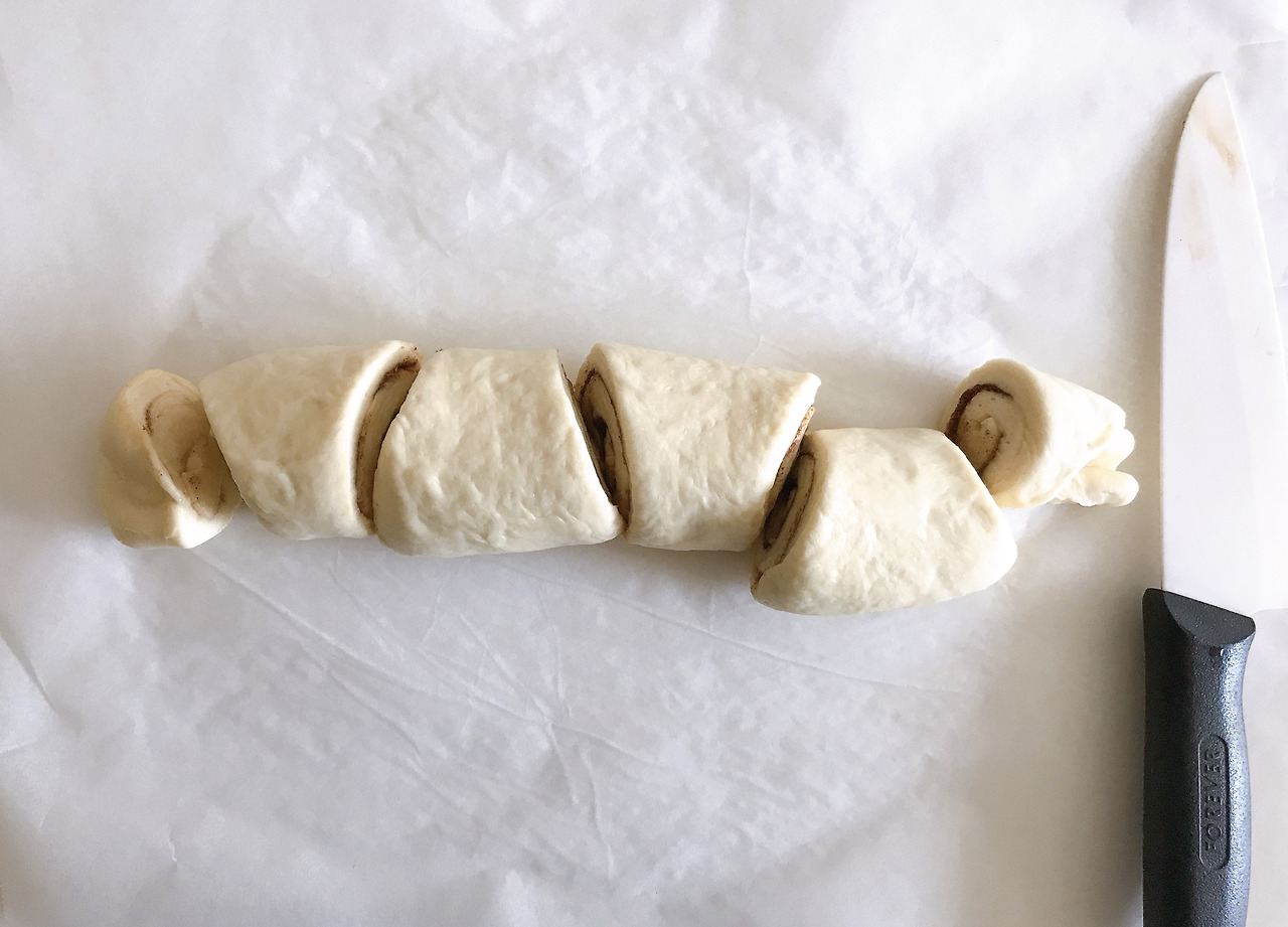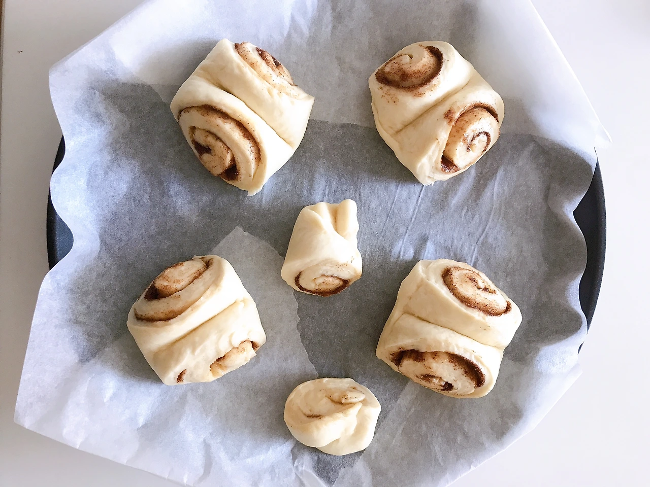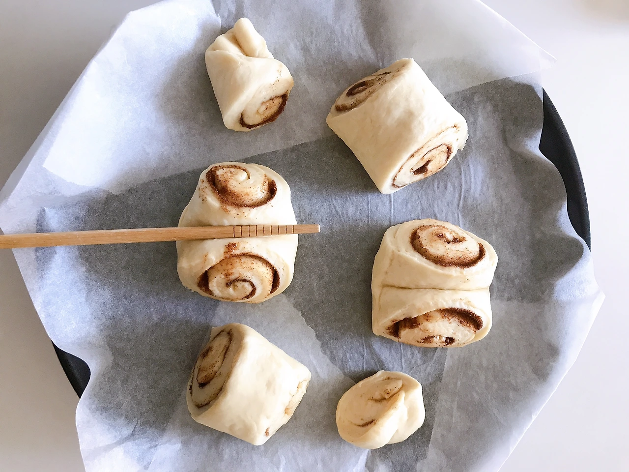 친구에게도 시나몬롤을 줄 생각이어서 모양이 일정했으면 했다. 그래서 김밥처럼 돌돌 만 반죽의 양 끝을 김밥 꼬다리 자르듯 잘라낸 후에 남은 부분을 일정하게 4 등분했다. 꼬다리는 구워서 내 입으로 들어갔다. 꼬다리를 먹는 것은 요리를 한 사람의 특권이다. 시나몬롤은 갓 구웠을 때가 제일 맛있고, 식어도 먹을만 하지만 약간 단단하다. 식은 시나몬롤을 갓 구운 상태로 되돌려놓을 방법이 없을까 고민하다가 시나몬롤 체인점인 '시나본' 포장지에 먹기 전에 전자레인지에 데우라는 문구가 있었던 것이 생각났다. 식은 시나몬롤을 전자레인지에 20초 정도 돌렸더니 다시 따뜻하고 말랑말랑하게 먹을 수 있었다.