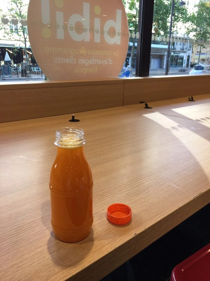 파리 여행 동안 묵었던 숙소 앞 슈퍼에 착즙 오렌지 주스 기계가 있었다. 카운터에 가서 계산을 하고 오렌지 주스 담을 병을 하나 받았다. 그 병을 착즙 주스 기계 밑에 두고 버튼을 누르니 눈 앞에서 오렌지가 착즙 되는 과정을 볼 수 있었다. 기계가 투명해서 오렌지 하나가 굴러와서 착즙이 된 후 오렌지가 하나 더 굴러오는 과정이 그대로 보였다. 이렇게 병이 찰 때까지 3-4개의 오렌지가 사용됐던 것 같다. 착즙 과정에서 오렌지 즙이 튀어 상큼한 냄새가 났다. 다른 재료는 조금도 첨가되지 않은 말 그대로 100% 착즙 오렌지 주스였다.