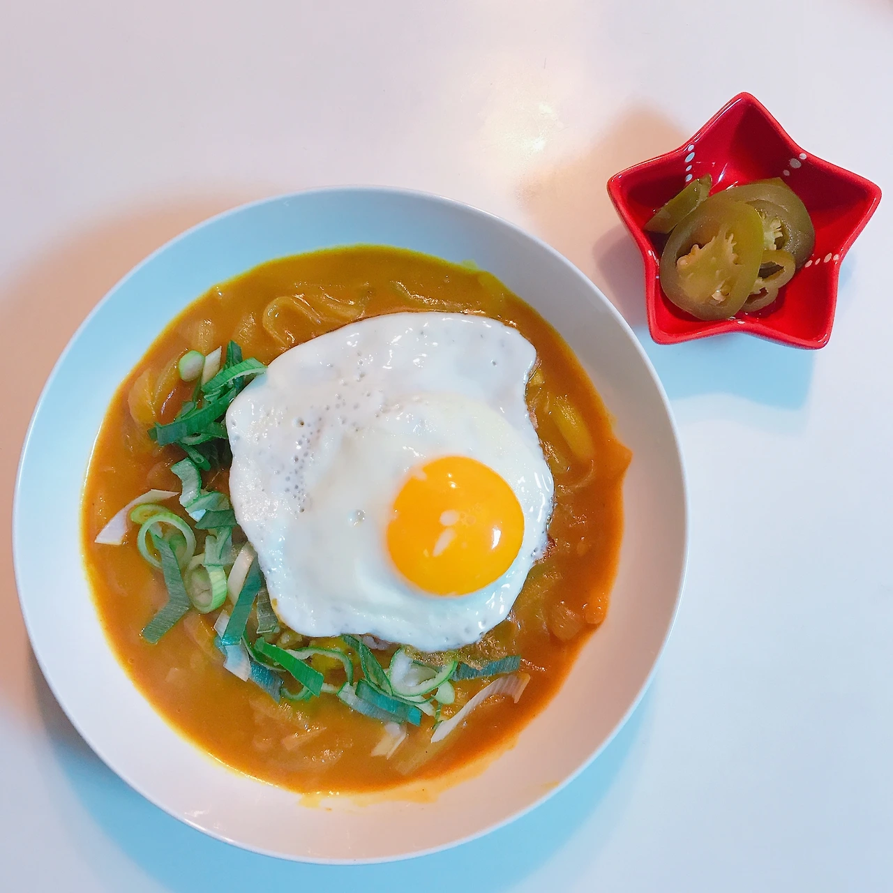 이 날 냉장고를 열어보니, 역시 자취생에게는 계란후라이가 답인가 싶다. 넓은 그릇 한가운데에 밥을 얹고 카레를 둘렀다. 그리고 달걀후라이를 하나 얹었다. 그다음에는 냉장고에서 찾은 대파를 총총 썰어서 뿌렸다. 이만해도 충분히 맛이 훌륭하다. 식구들과 함께 먹으면 각자 좋아하는 토핑을 얹어서 먹는 것도 나름의 작은 이벤트가 될 수 있겠다.