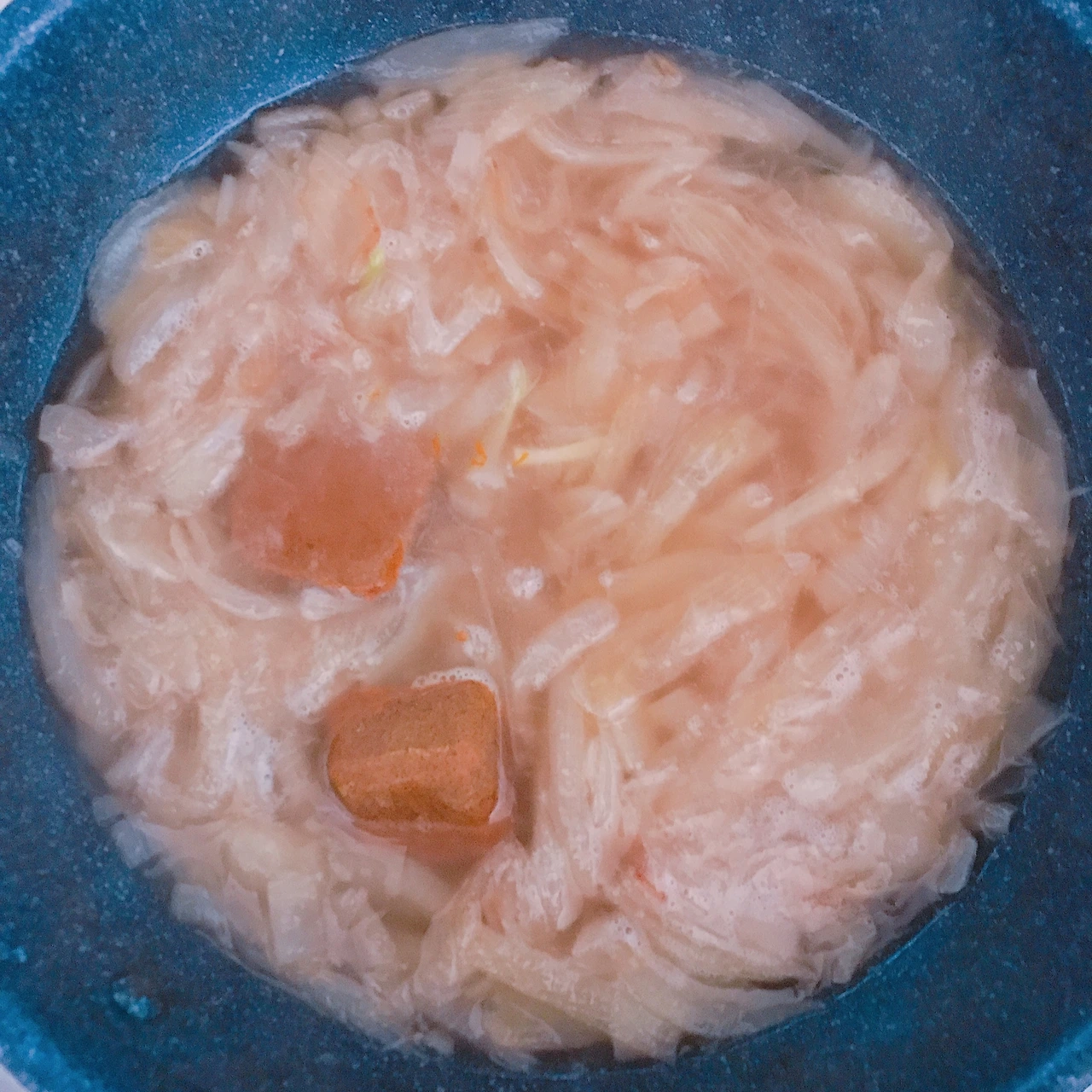 2. 볶은 양파에 물 500ml를 붓고 끓인다. 물이 끓으면 고형카레 3조각을 넣고 풀어준다. 약 10분 끓이고 나면 우유를 조금 붓고 잠시 더 끓이면 완성. (우유는 선택사항이다.)