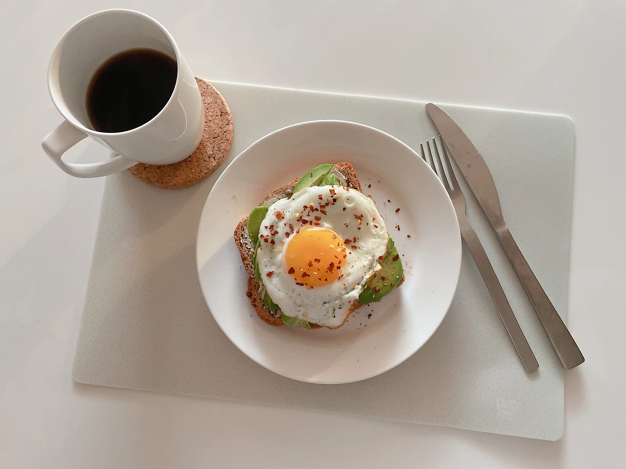 토스트 한 식빵 위에 크림치즈를 얇게 바르고 얇게 썬 아보카도를 올리고 반숙 계란을 얹은 후 후추와 페퍼 후레이크를 뿌린다. 끝.