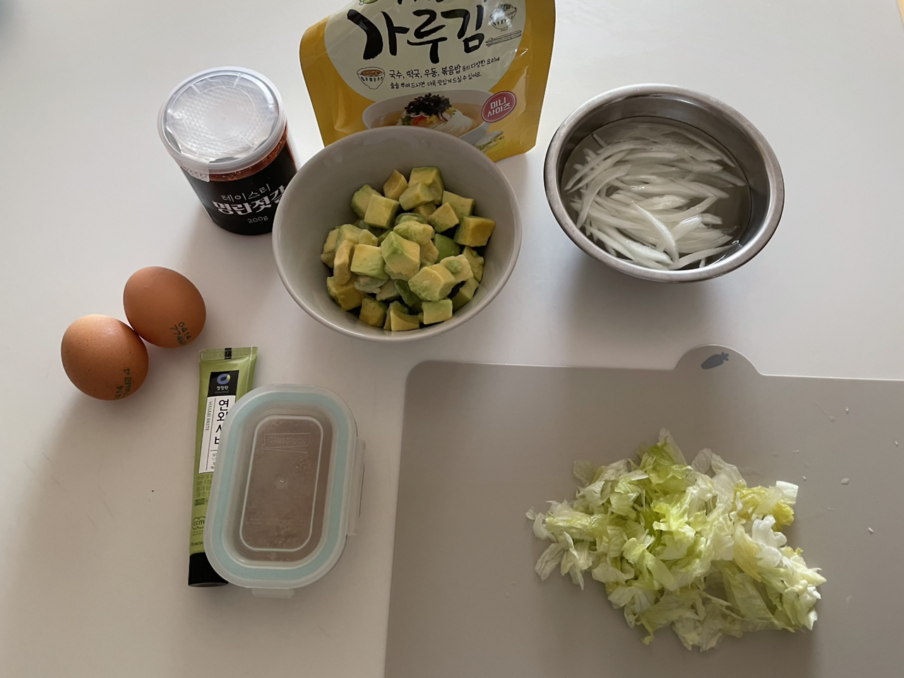 기본: 밥 한 공기, 아보카도 1/2개 또는 냉동 아보카도 한 줌, 명란 1/2개, 참기름, 계란 1개