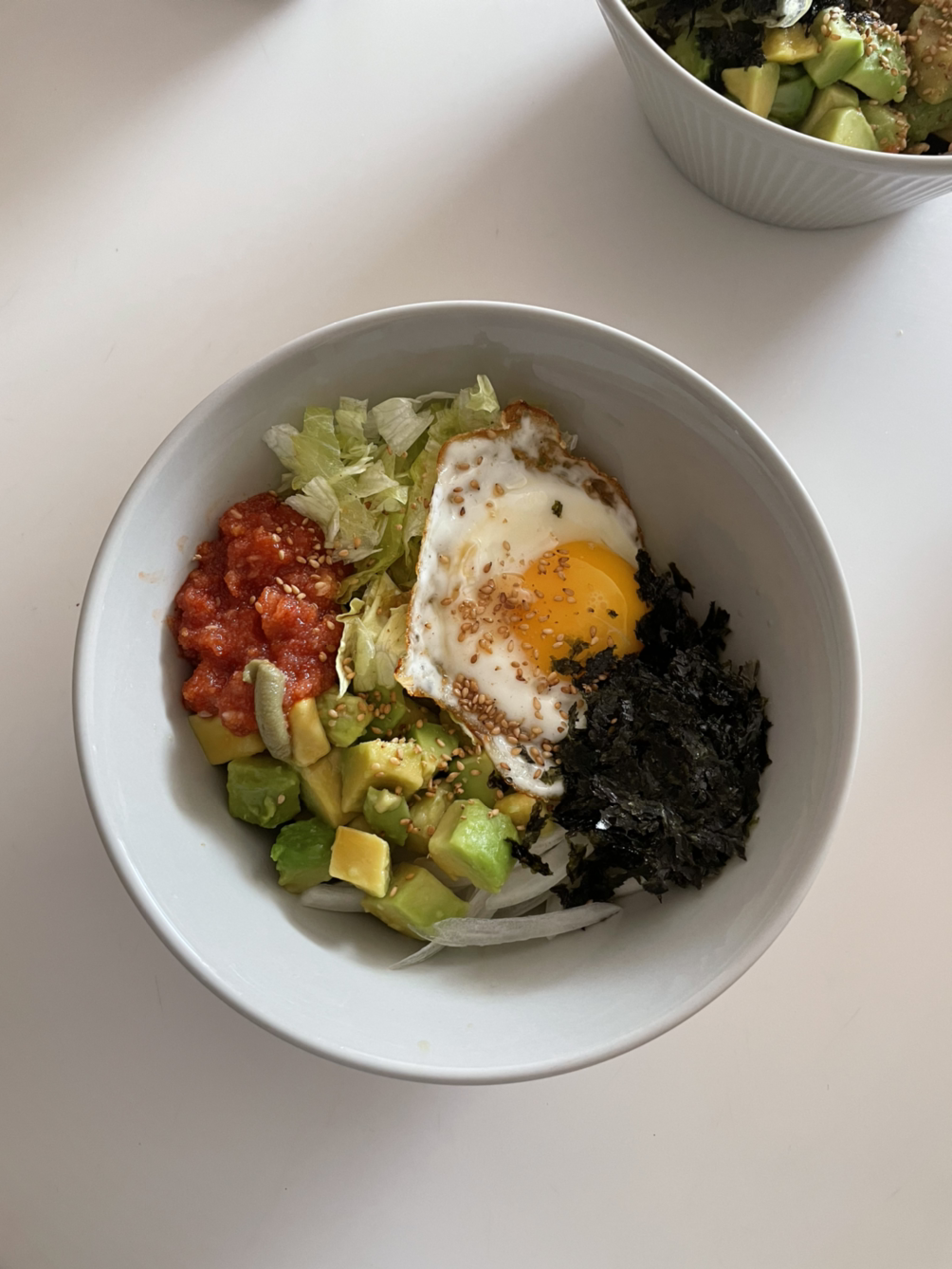 아보카도 한 망을 사서 후숙을 시킨 후 더 이상 후숙이 빨리 진행되지 않도록 냉장고에 넣어두고 아침마다 하나씩 꺼내먹었다. 편리하게 냉동 아보카도를 사용해도 좋다. 냉동 아보카도를 전자레인지에 살짝 돌리면 말랑말랑해진다. 기본 재료는 밥, 아보카도, 명란, 참기름, 계란 프라이다. 여기에 취향에 따라 다른 재료를 추가시키면 된다. 어린잎 채소나 샐러드 채소가 있으면 잘게 썰어 넣어도 되고, 얇게 썬 양파를 넣거나, 김가루를 뿌려도 좋다. 간을 추가하고 싶으면 간장을 조금 넣고, 알싸한 맛이 좋으면 고추냉이를 살짝 추가해도 된다.