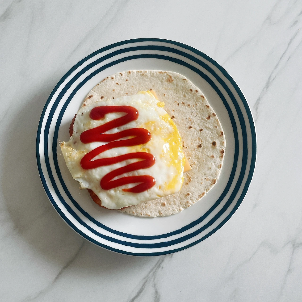 4. 데운 또띠아에 치즈를 깔고, 계란과 해쉬브라운을 올린 다음 케첩을 뿌린 후 또띠아를 돌돌 만다. (취향에 따라 핫소스, 스리랏차 소스, 머스터드를 추가해도 된다.)