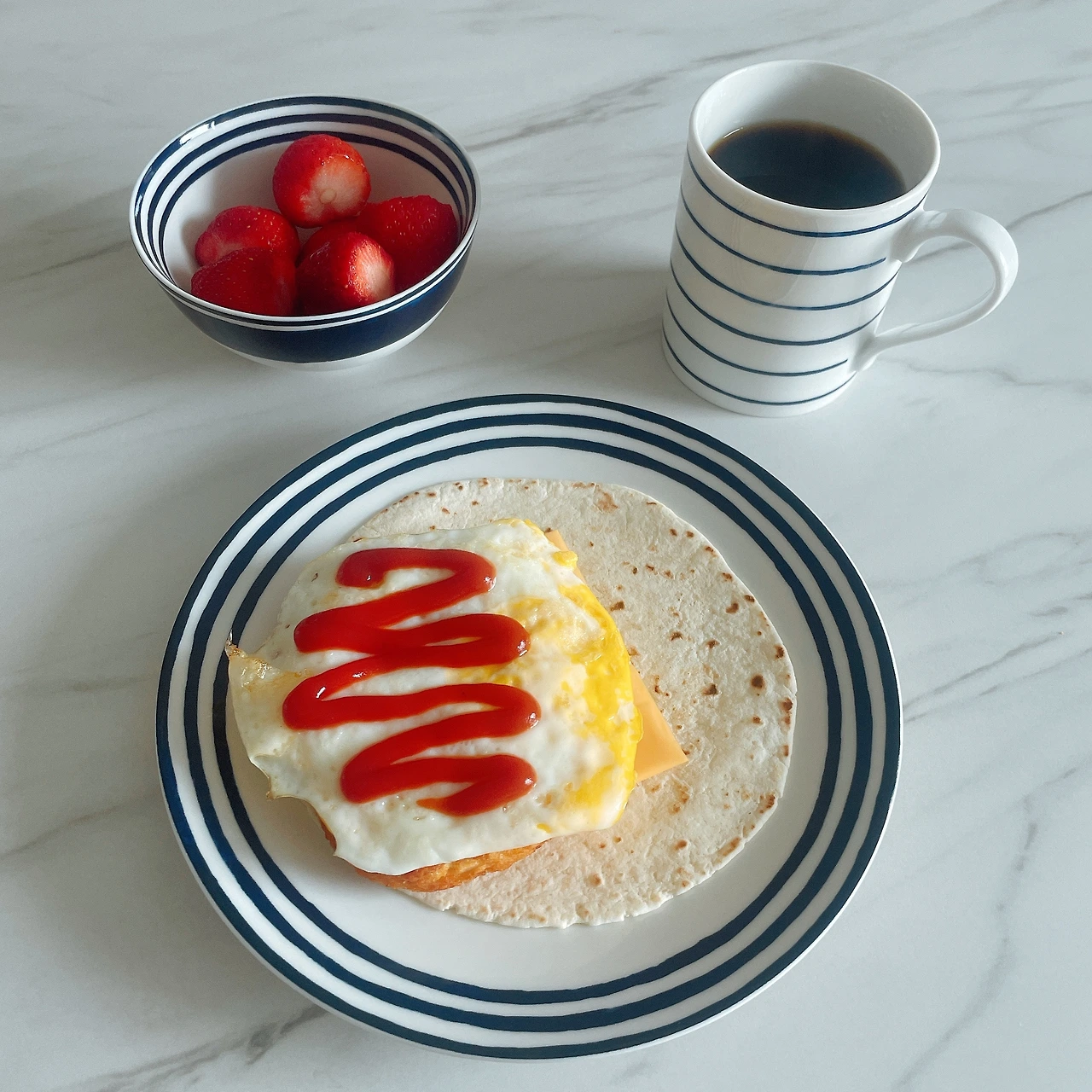 또띠아를 기름 없는 후라이팬에 앞뒤로 데우고, 냉동 해쉬브라운을 에어프라이어에 굽고, 계란후라이를 부치고, 슬라이스 치즈와 케첩을 준비한다. 집에 있는 또띠아가 6인치(15센티미터 정도)라 작았다. 8인치 이상은 돼야 팔던 것처럼 부리또 스타일로 돌돌 말아서 먹을 수 있는 것 같다. 6인치는 작아서 어쩔 수 없이 반으로만 접어먹었다, 타코처럼.