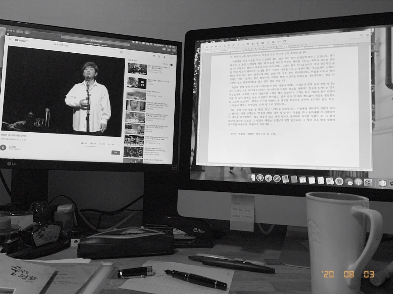 대개의 아침 풍경. 매일 아침 글을 쓴다. 논문을 쓰고, 이따금 메모한 것들에 살을 붙여 에세이를 쓰거나, 시도 쓴다. 글을 쓸 시간을 못 만드는 것으로부터 생활에 대한 내 게으름을 진단하고, 글을 씀으로써 어제 내가 해결하지 못했던 것들에 대한 아쉬움과 같은 감정적 잔여물을 긁어낸다. 그리고 오늘을 산다. 그렇게 만들어 둔 루틴들이 나의 일상을 채운다.