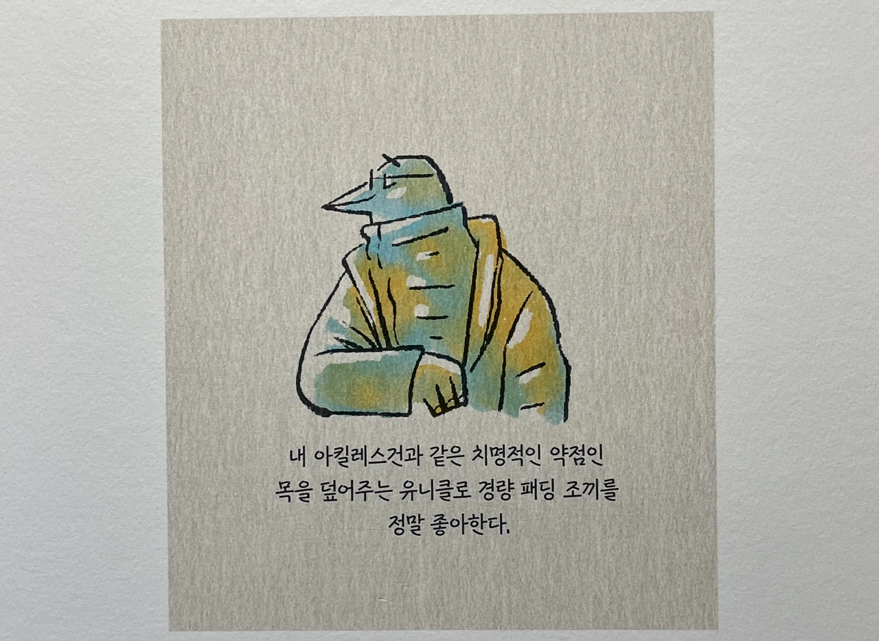 루이스 멘도의 유니클로 경량패딩에 대한 메모를 보며, 그에게 매력을 특별히 느꼈다. 전시된 그의 필통에서 본 세일러 커스텀 헤리티지 912 만년필에서 그의 취향에 흥미를 느꼈지만, 유니클로 경량패딩에서는 그의 삶에 대한 태도에 관심을 갖게 됐다.