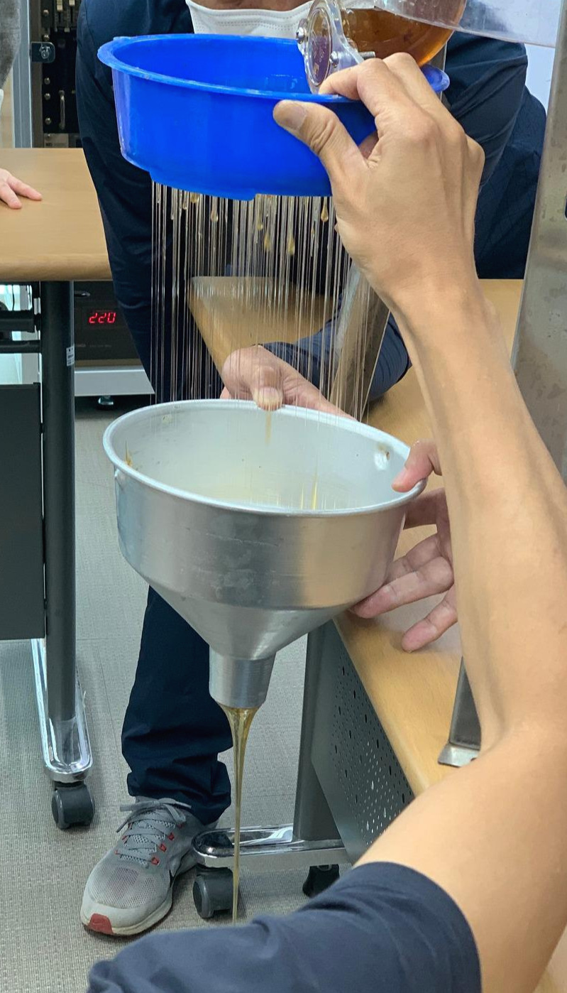 시험을 치른 이후에는 모두가 기다린 채밀 시간, 꿀을 직접 수확하는 시간을 가졌다. 전문 양봉인과 달리 우리는 다 수작업으로 꿀장에서 꿀을 털어내야 했다. 꿀장을 안에 넣고 사람이 직접 손으로 돌려서 원심력을 이용해서 빼내는 기계였는데, 기계를 돌려 꿀이 빠져나오기 시작하자 강의실 안에 아까시 꿀향이 가득 찼다. 향기로우면서도 진득한 냄새. 그간 내가 마트에서 사먹어본 꿀과는 차원이 다른 꿀이 흘러내리고 가득차고 있었다.