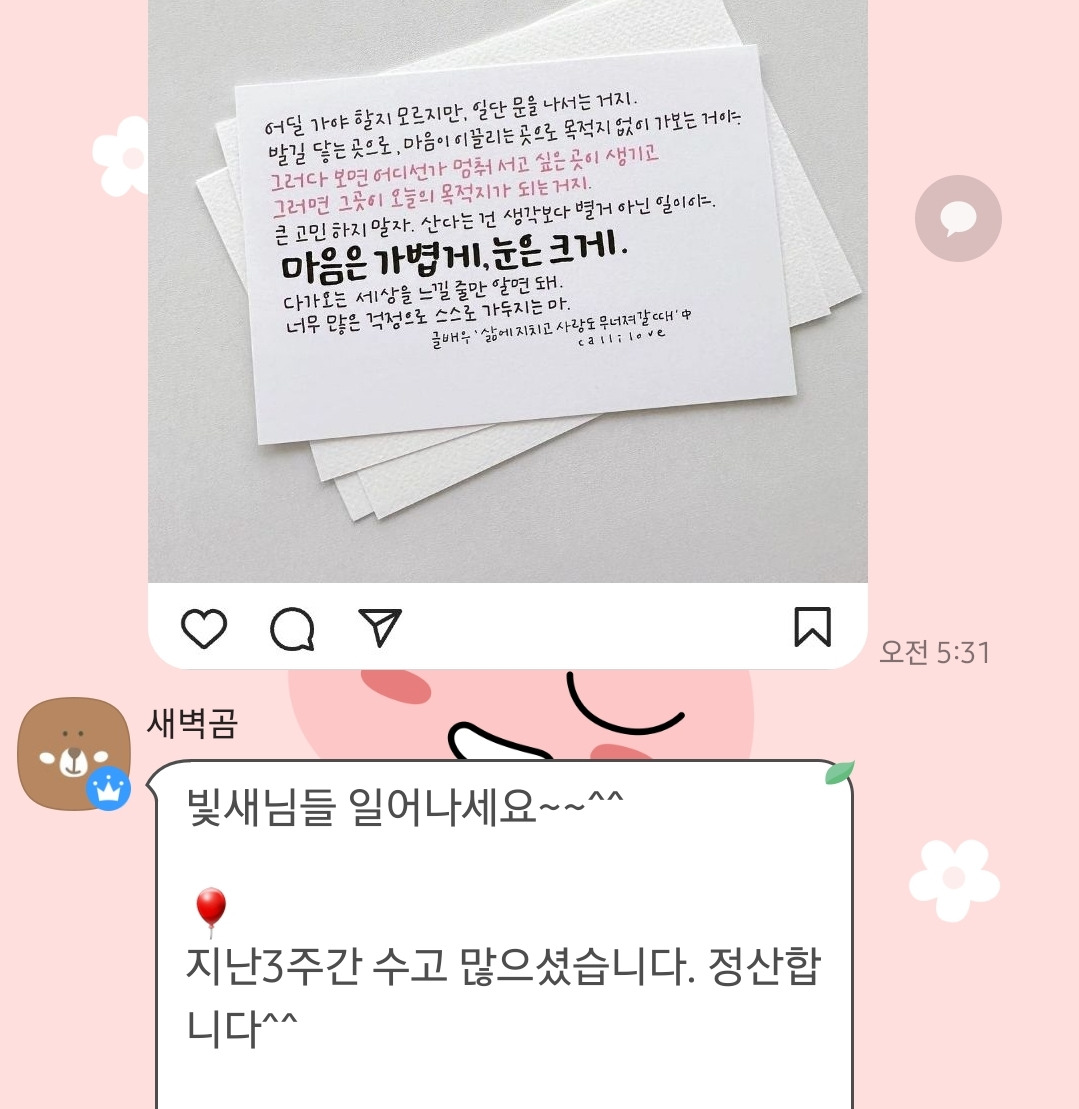 5시 반에 일어나서 인증사진 보내고 1시간 동안 오롯한 자기 시간을 가진 후 긍정확언을 나누면 끝이다.