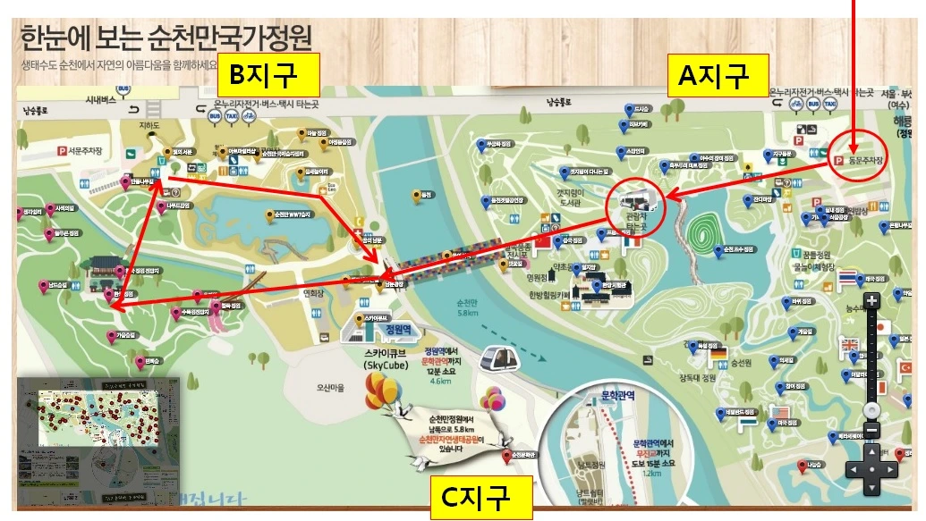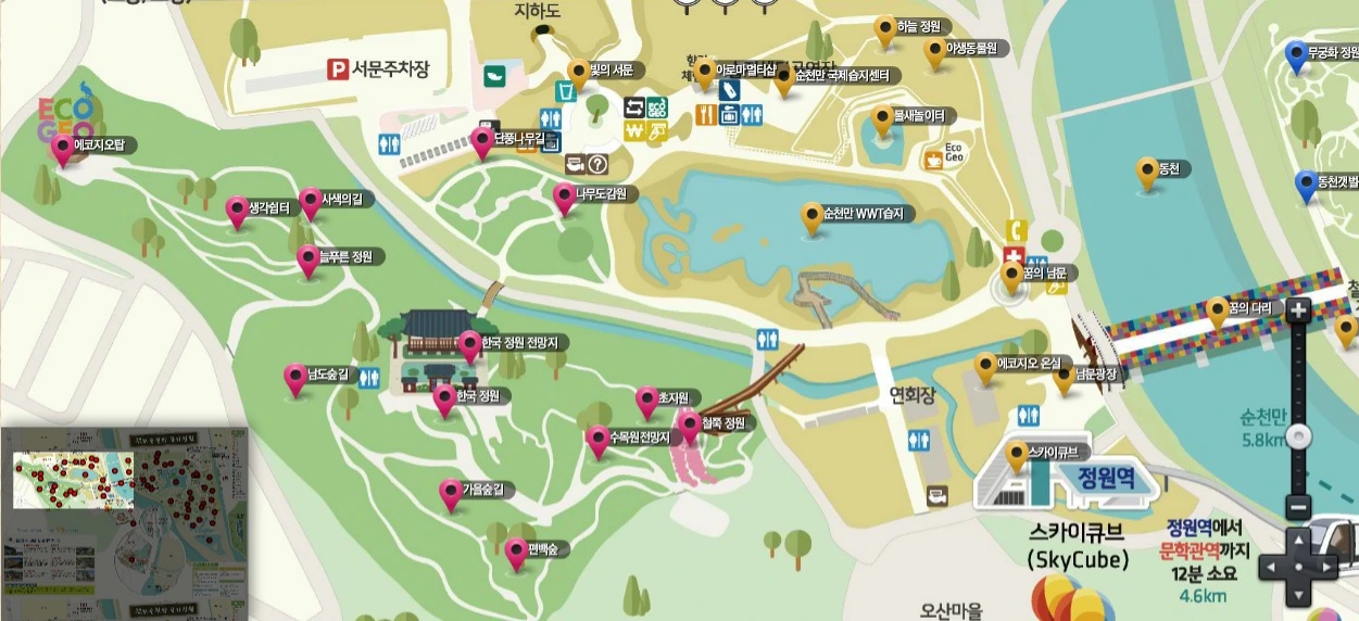 순천만 국가정원에서 대략 5~6km 정도 떨어져있는데 스카이큐브라고 하는 모노레일을 별도로 이용하거나 차량을 이용해 이동해야 한다.