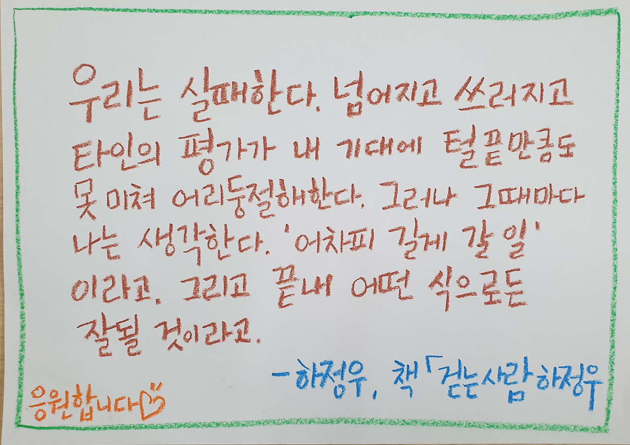 이번 주에는 자녀들의 수능을 앞둔 선생님들께 응원의 선물을 제공하자는 친목회장님의 지시를 받았다. 언컨택트 시대에 맞게 카카오톡 선물하기 기능을 사용하기로 했는데, 선물만 띡 보내기엔 너무 삭막했다. 아날로그 감성에 늘 푹푹 젖어있는 나는 그래도 짧은 메세지라도 전달해야 되겠다 싶어 도화지와 크레파스를 셋팅했고 핸드폰 사진첩 폴더에 소중하게 품고 다니는 주옥같은 멘트들 중 하나를 골라 쓱쓱 써내려갔다.