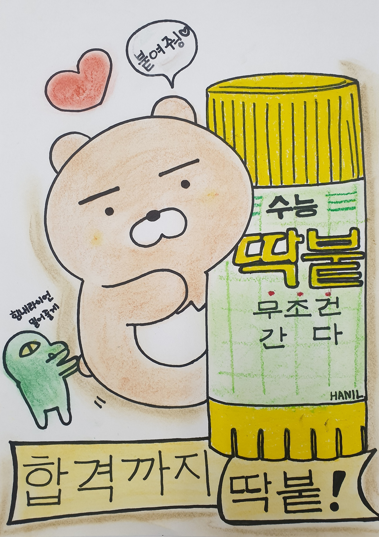그런 그가 내 작업을 보더니 수능대박 부적도 하나 그려보자길래 "어? 그건 니가 하면 되겠다"며 부드럽게 토스했고 친구는 이내 작업에 착수했다. 라이언이 딱풀을 꼭 부여잡고 딱풀처럼 딱 붙으라는 귀여움이 강력한 메세지를 뚝딱뚝딱 잘도 그려내는 그를 동학년 선생님들은 마구마구 칭찬했지만 이 완벽주의자는 부족하다며 수정에 수정을 거듭했다. 그렇게 완성된 나의 문장과 그의 그림을 사진으로 찍어 선물과 함께 보내드렸고 받으신 분들의 반응도 좋아 흐뭇한 시간이었다.
