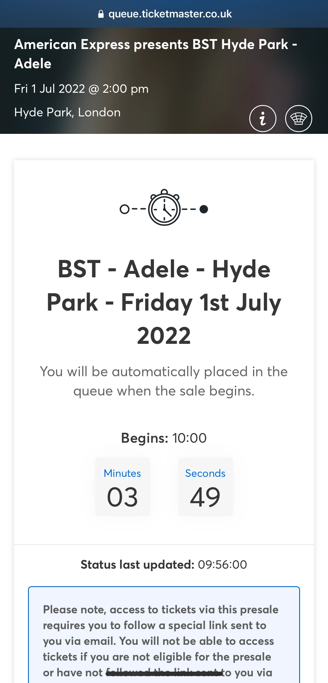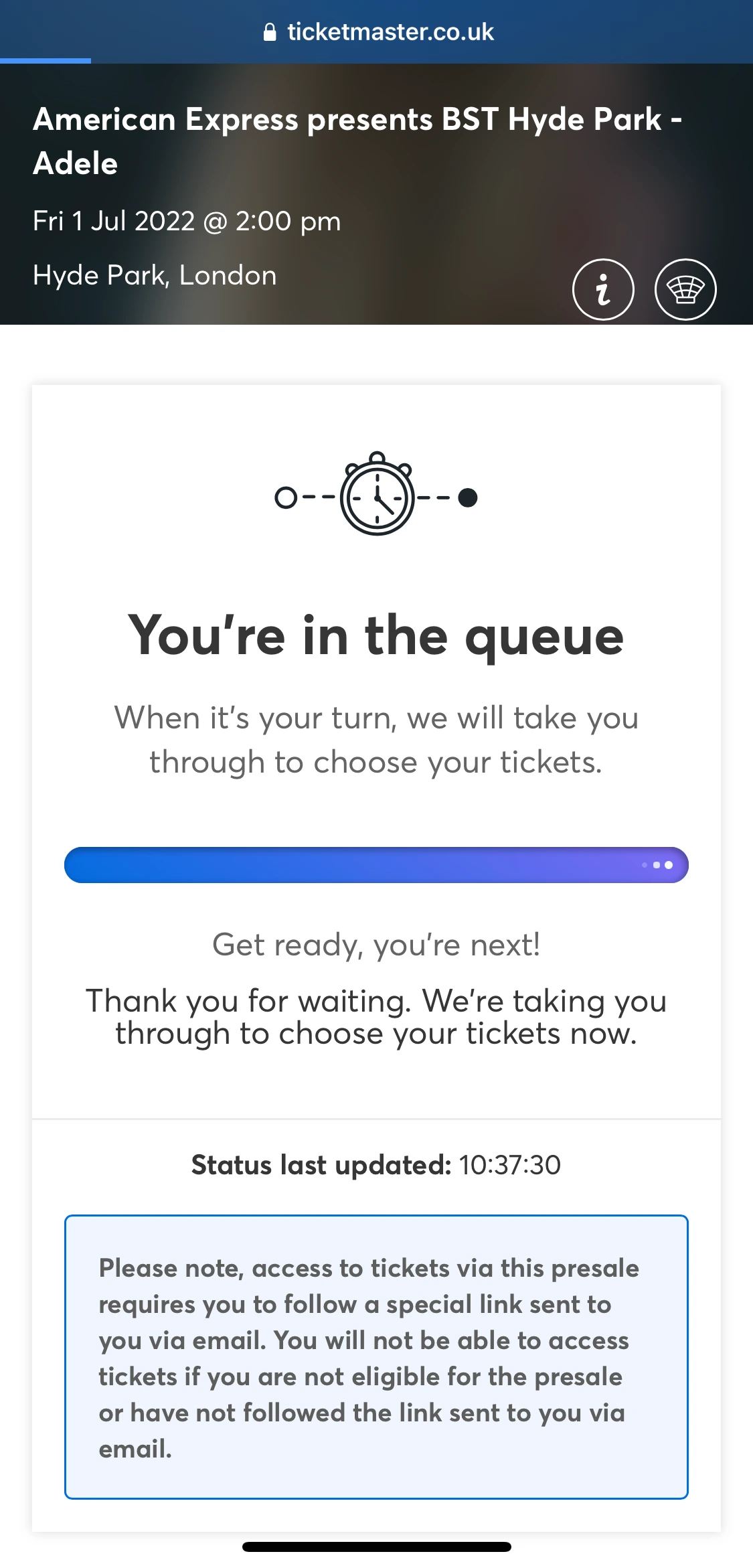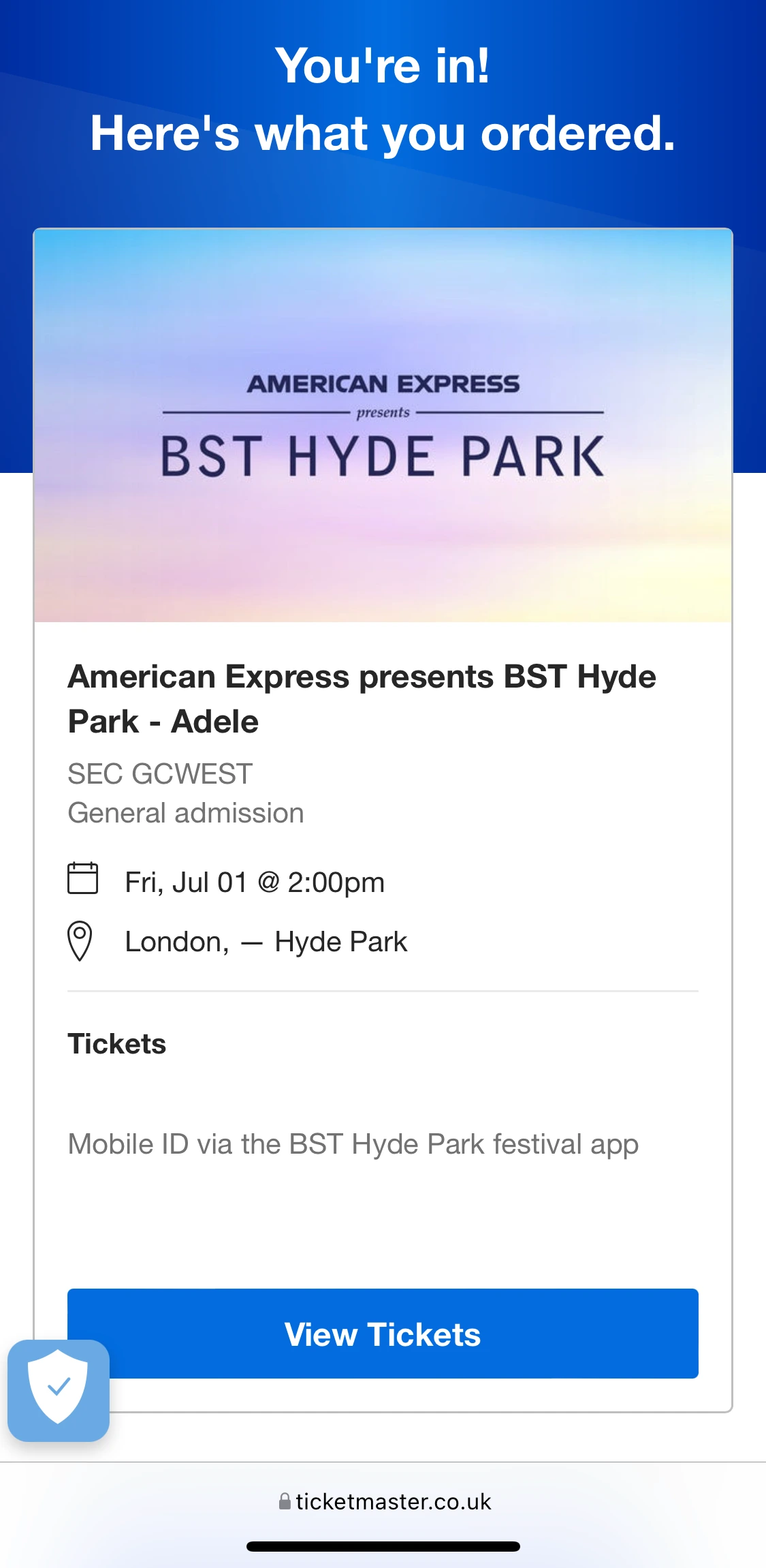 런던은 아델의 고향이다. 런던 토트넘에서 태어나고 자란 아델은 영국 사람들에게 큰 자랑거리이다. 런던에서도 무려 5-6년 만에 하는 공연이라 당연히 치열할 거란건 알고 있었다. 게다가, BST Hyde Park는 매년 런던에서 열리는 큰 페스티벌 중 하나이기에 예매 창까지 가는 대기 시간이 정말 길었다.