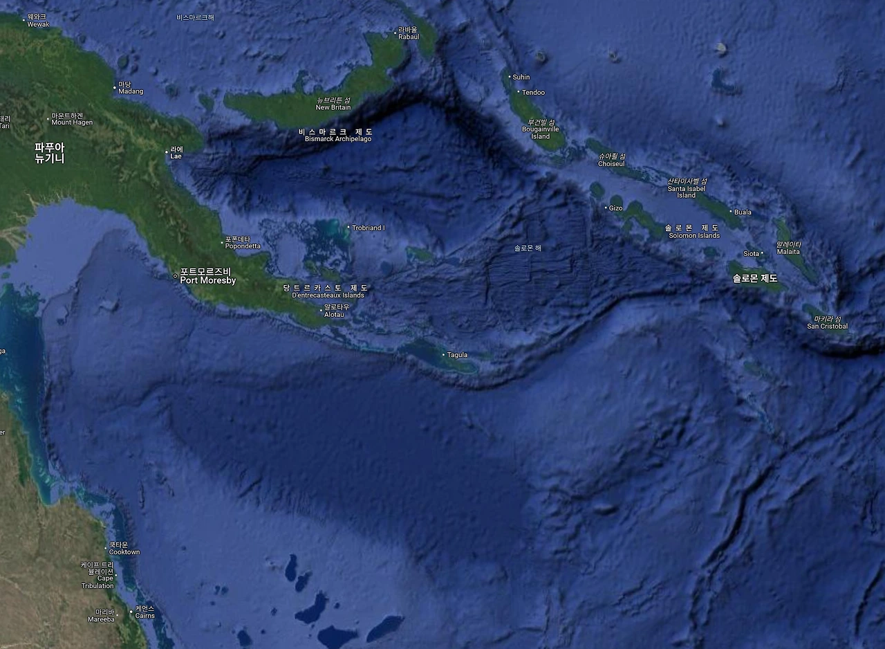 일본군은 미드웨이 해전 이전에 산호해에 있는 포트모르지비를 침공하는 MO 작전을 수립합니다. 일본군이 포트모르지비를 점령한다면, 뉴기니의 나머지 지역과 오스트레일리아 본토를 공략하기 쉬워지기 때문입니다. 지도를 보면, 일본군의 계획을 알 수 있죠.지도의 북쪽에 위치한 라바울이 일본군의 해군기지가 있는 곳이고, 좌축 하단의 쿡타운이 오스트레일리아 본토입니다. 우측의 솔로몬 제도에 나중에 유명해질 콰달카날 섬이 있습니다.