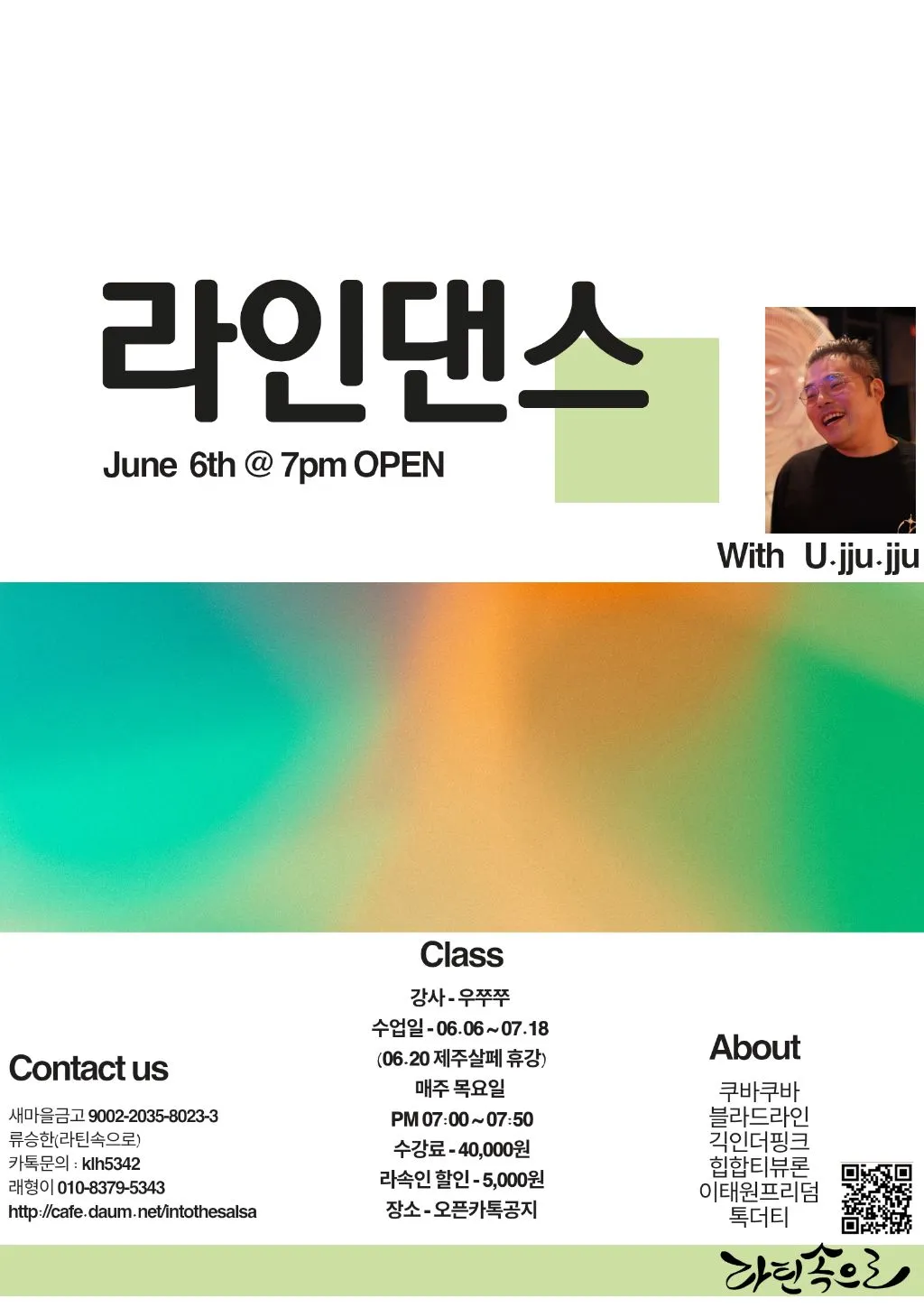 수업 시작은 저녁 7시. 6시 40분쯤 도착하니 우쭈쭈쌤이 혼자서 음악을 틀어놓고 몸을 풀고 계셨다. 몸을 푼다기보다는 벌써 한껏 리듬에 취해 즐겁게 춤을 추고 계셨다. 단체면 더 좋고, 혼자여도 상관없는 것이 어쩌면 춤의 매력이 아닐까 생각했다.
