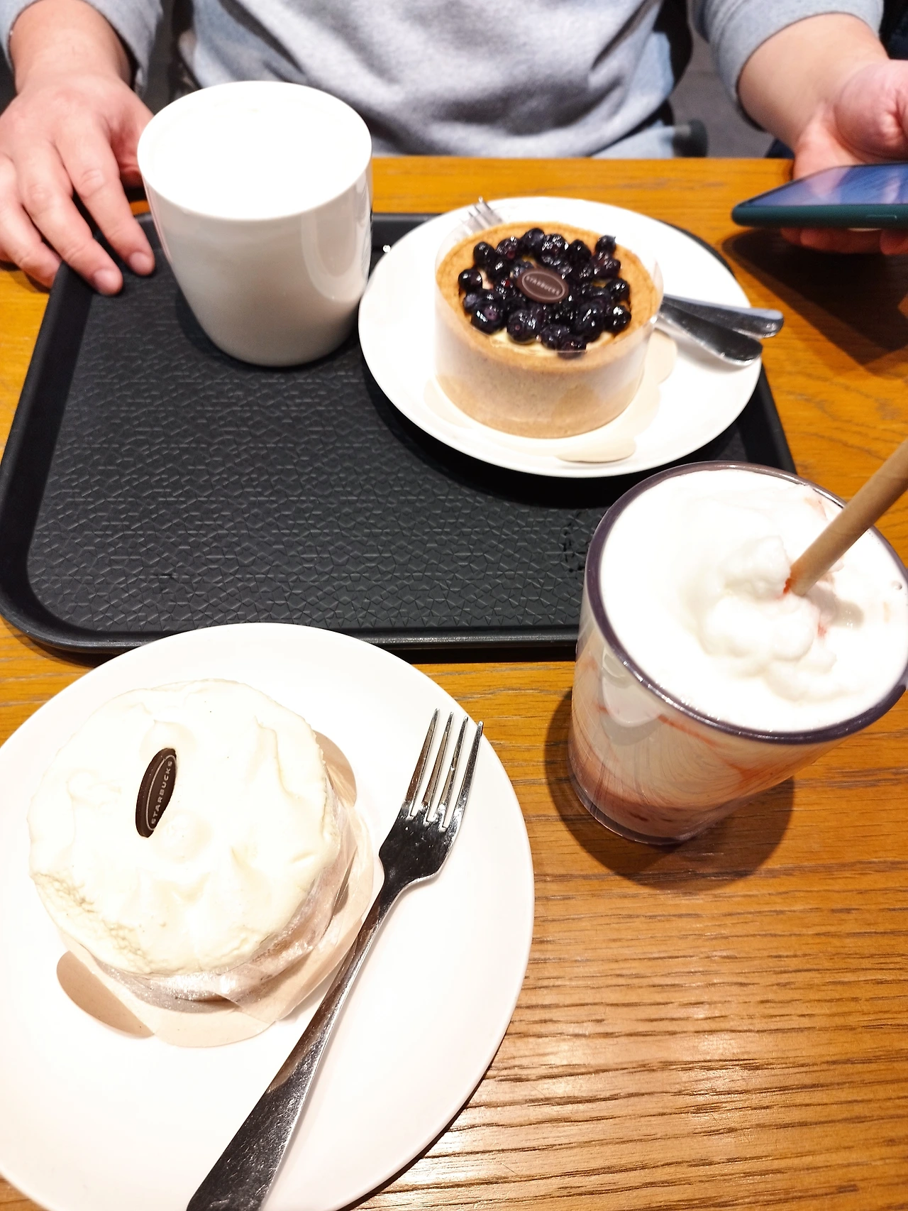 저녁을 먹고 난 후 방문해서 음료를 3개 시키면 분명 다 먹지도 못하고 버리고 나올 것 같아서 음료 두 개에 슈크림 바움쿠헨하고 블루베리쿠키 치즈케이크를 시켰는데 셋이서 먹기에 딱 맞는 양이었다. 커피는 내 취향에 맞지 않아서 별로인데 그래도 케이크는 골라서 먹을만한 케이크도 있고, 남편은 밀크티를 좋아해서 스타벅스 가면 차이 티 라떼를 주문하고 아들은 커피가 아닌 음료에서 자기가 먹고 싶은 메뉴를 골라서 주문해 준다