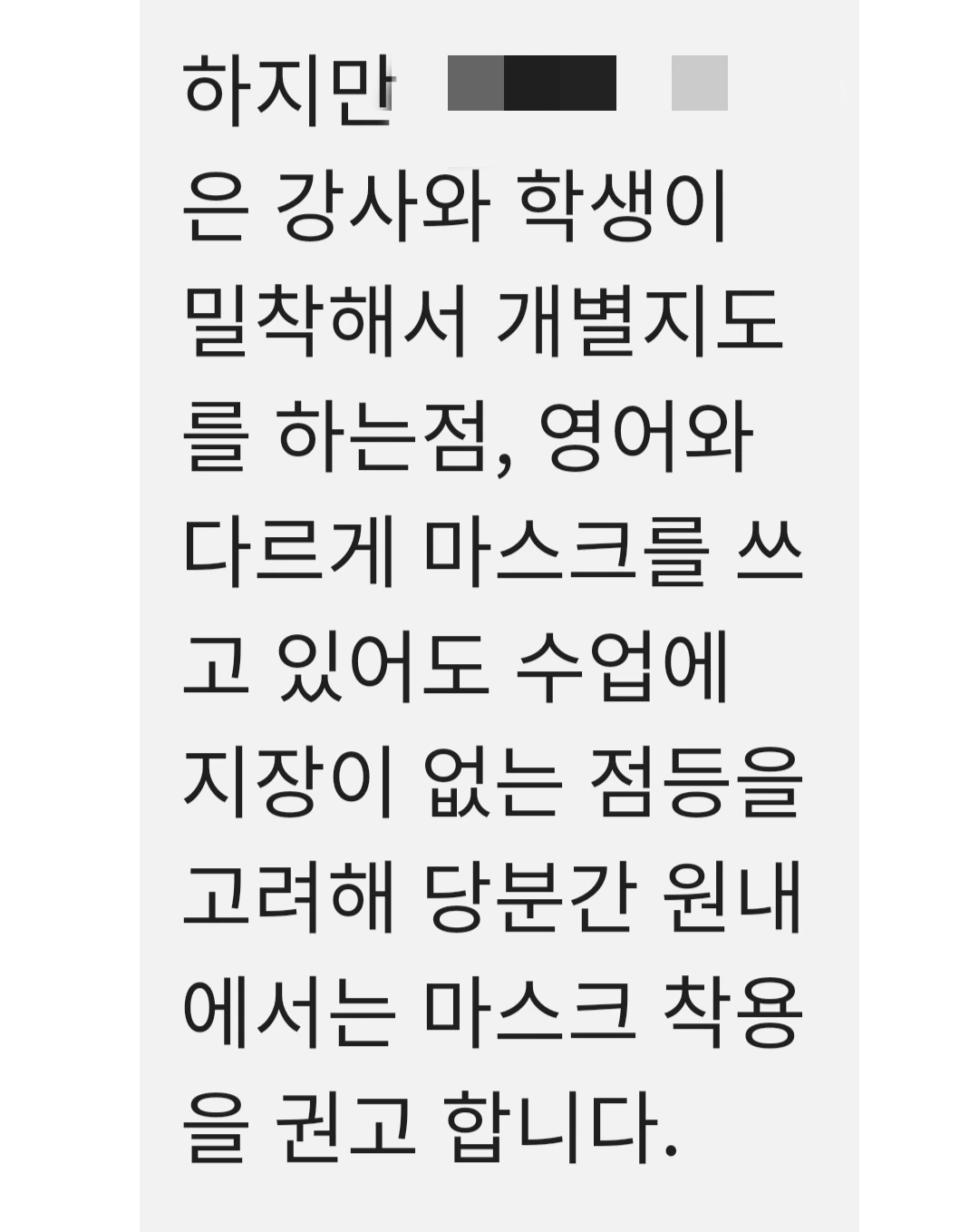 실내공간 의무 착용 해제가 되면서우리 학원도 마스크를 벗고 수업하는 선생님이 한 명 있다. 원장님 또한 마스크를 쓰지 않고 일을 하시니 내가 우리 학원은 모두 쓰고 일하자고 주장하기가 눈치가 보일 수밖에 없다. 아들이 다니고 있는 수학 학원은 마스크 착용해서 등원해 달라고 문자가 왔다. 학원마다 저마다의 사정이 있으니 이건 맞고 틀리고의 문제가 아니므로 내가 뭐라고 할 수는 없는 노릇이다.
