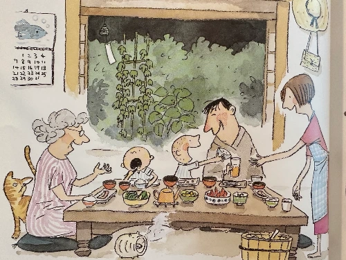 집으로 돌아오니 외삼촌, 외숙모가 목욕물을 받아놨다. 샤워를 하고 먹는 저녁 밥맛은 그야말로 꿀맛이다. “텃밭에서 따 온 토마토랑 오이, 옆집 두부가게 아저씨가 만든 두부에다, 아침까지 바다에서 헤엄치던 싱싱한 생선을 먹었다." 아침까지 바다에서 헤엄치던 생선이라니. 건강한 밥상으로 속을 채운 아이들은 갑자기 졸음이 몰려온다. "보송보송하고 해님 냄새가 나는" 이불을 덮고 잠이 든다.