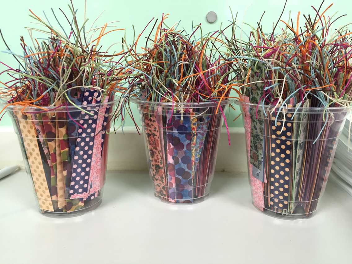 색지에 여러가지 디자인의 마스킹테이프를 붙여 자르고 햄프사를 달았다.