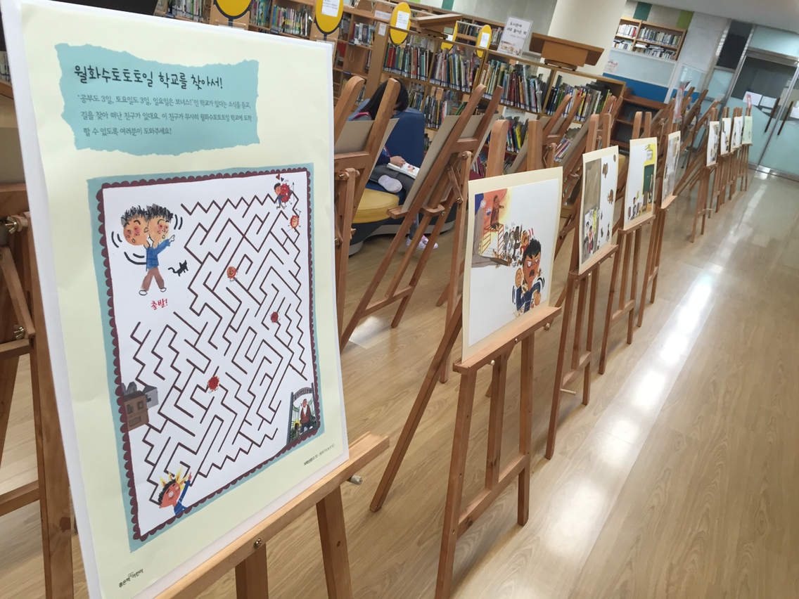 좋은책어린이출판사 홈페이지에서 내려받을 수 있는 활동지도 플로터로 크게 뽑아 전시해두면 모두 붙어서서 해보느라 여념이 없(을 것이)다. - 문닫고 난 후 전시하고 찍은 사진이라 아이들이 아직 없다 ㅎㅎ