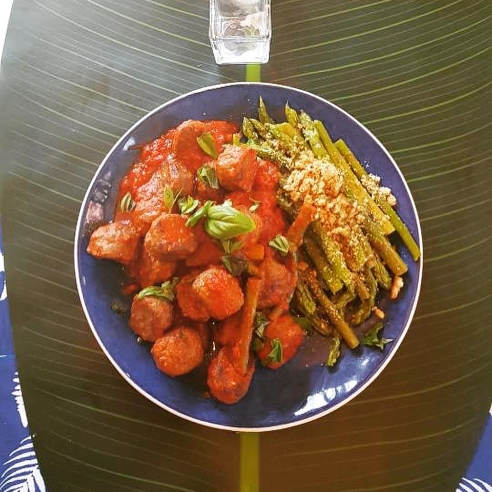 마지막으로 미트볼과 아스파라거스... 간 소고기에 빵가루와 치즈를 살짝 뭉치고 약한 불에 오래 굽거나 끓는 물에 살짝 데친 뒤에 프라이팬에서 볶아준다. 다만 고기 냄새를 제거하려면 다진 마늘을 넣고 볶기를 추천한다. 중간 정도 볶다가 마트에서 파는 병에 들은 토마토소스 반 병 정도 묻혀주면 된다. 5분 정도 볶은 뒤 바질을 송송 뿌려준다.