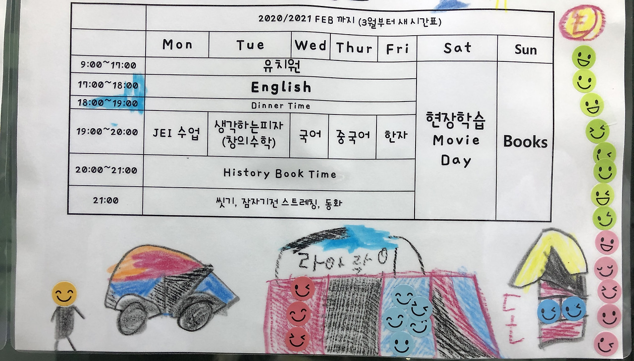 *참고로 시간표 속 'History Book Time'은 역사책을 읽는 시간이 아니다. 나만의 역사책을 만드는 시간으로 그림일기 처럼 그날 아이가 기록하고 싶은 일을 사진을 붙이거나 그림을 그려가며 쓰게 하고 있다. 이 시간이 아이가 하루를 돌아보게 함과 동시에 그림그리며 수다떨며 스트레스를 풀기도 한다*