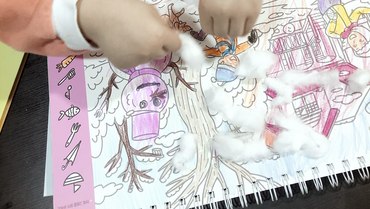 색연필과 사인펜으론 조금 아쉬워 안내서에 나와 있지는 않지만 눈의 느낌을 조금 더 주기 위해 솜을 가지고 왔다. 풀을 바르고 솜을 떼어 드문드문 함께 붙여 보았다. 솜을 붙이며 아이들이 즐거워했고 오늘 아침 눈 사람을 만들 때 어떤 느낌이었는지도 함께 이야기할 수 있었다. 손에 오면 녹는 눈의 느낌과 폭폭 한 솜의 느낌은 아무래도 다를 테니 말이다.