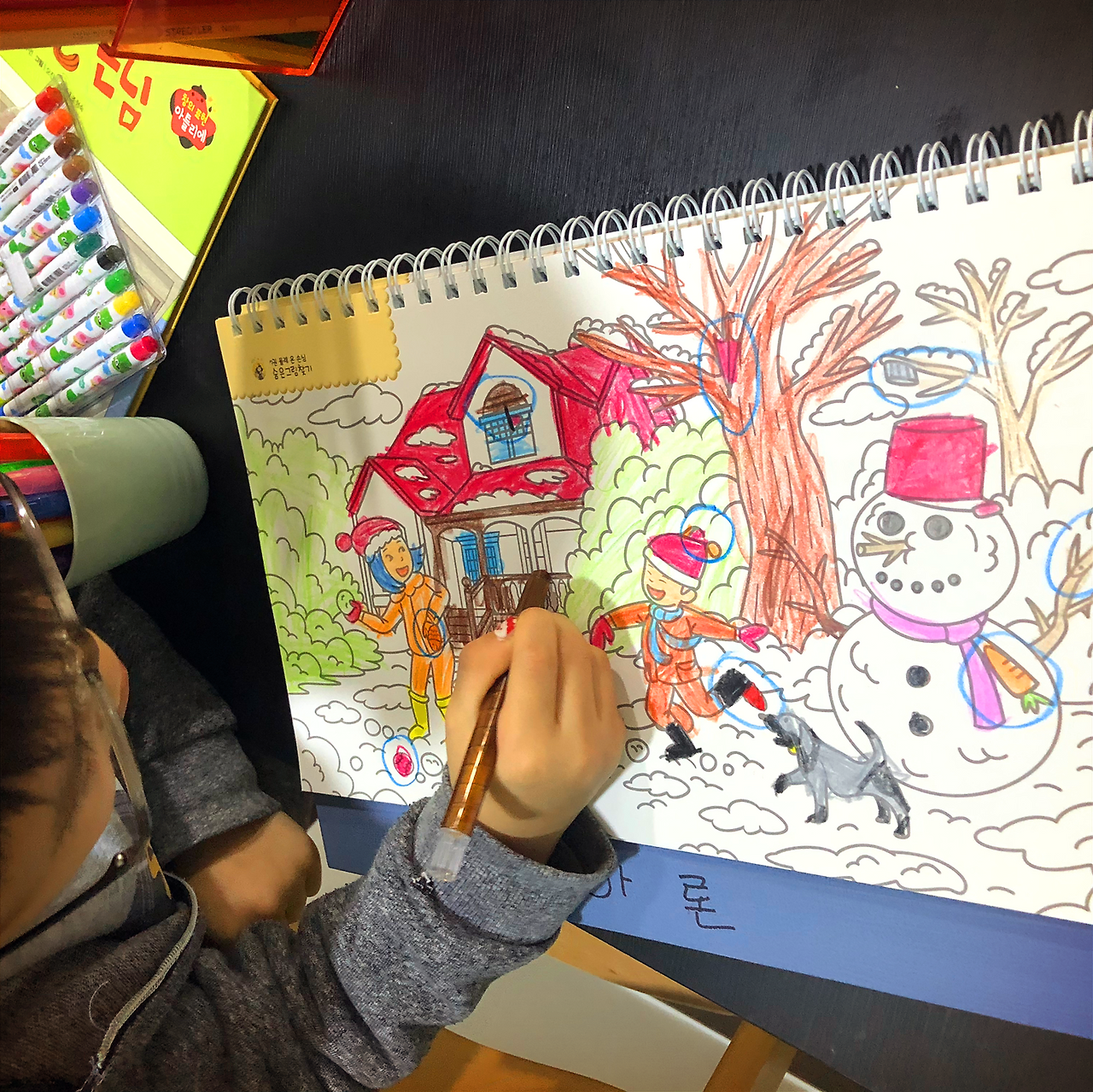 7살 아들은 꼼꼼하게 작은 빈칸도 채워가며 색칠했지만 5살에게는 아직 집중력이 부족한가 보다. 지붕을 빨갛게 칠한다 해 놓고는 온 집에 불이난 듯 빨간색을 마구 칠해 놓았다. 역시 홈스쿨의 현실은 그다지 우아하지 않다.