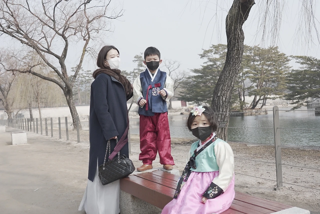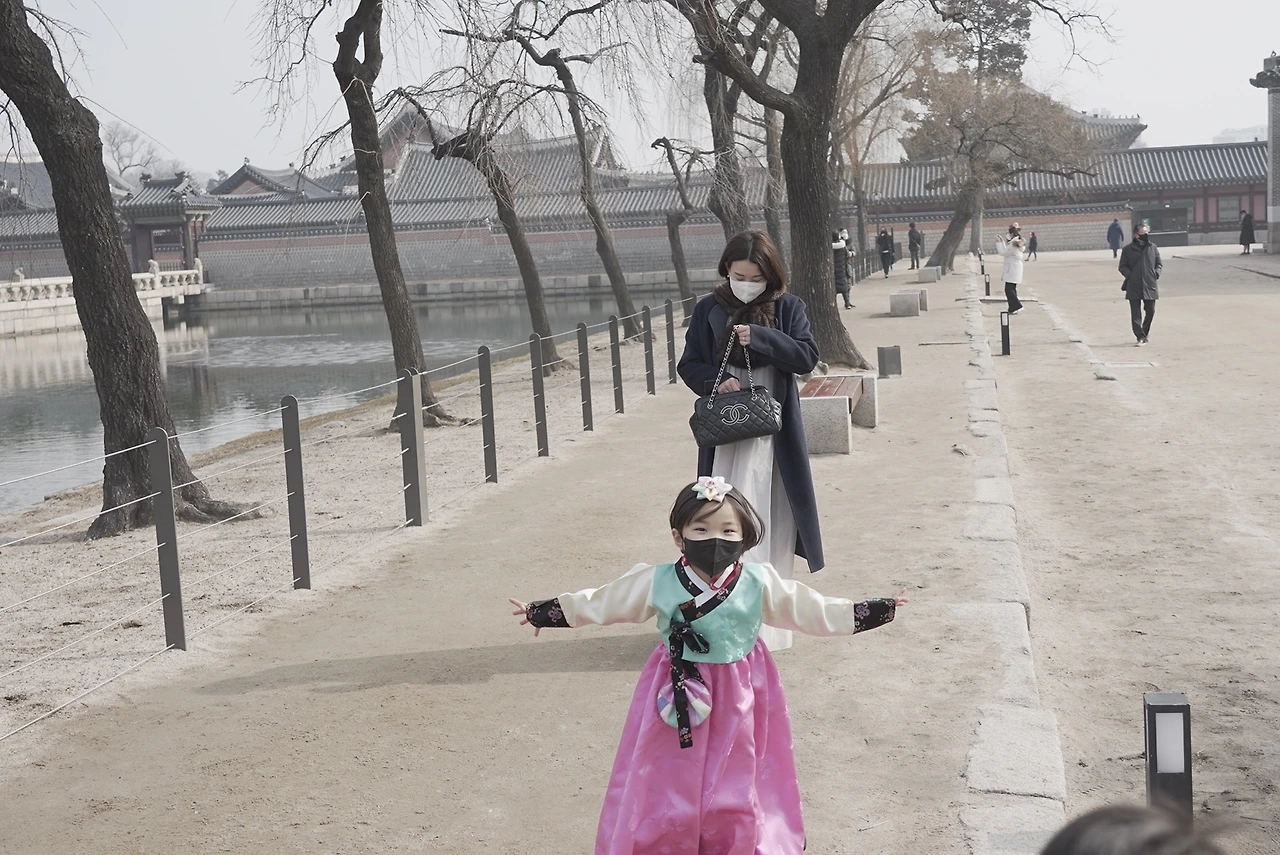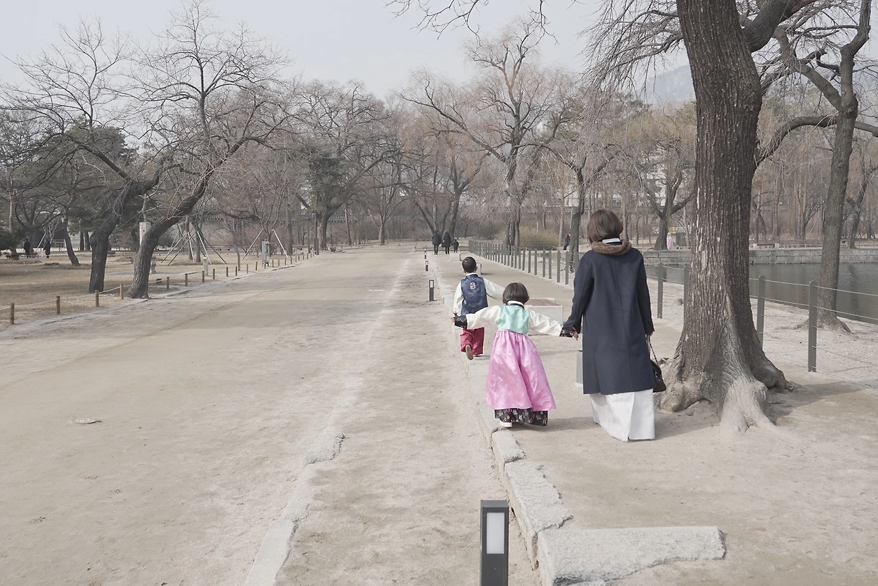 아이들은 한복을 입고도 자유롭게 뛰어다니며 신이 났다. 나는 경회루며 그 역할이나 왕이랑 왕비가 어디서 지내는지 설명해 주려고 노력했는데, 그 말들을 다 들었는지 못 들었는지 아이들이 뛰어다니기에 바빴다. 요즈음 나온 한복들은 편하게 끈도 없이 찍찍이로 부착되고 아이들 몸에 감기는 부분도 고무줄로 편하게 만들어져서 한복 불편하다 소리가 없었다. 고름도 아예 바느질로 고정이 되어 나왔으니 편하다. 다만 그저 전통방식을 고수한 나의 한복이 정말 불편했다. 아이들과는 반대로 나는 대문을 나서서 나들이하는 내내 한복이 불편하다 소리를 20번도 더 한 것 같다.(라이크라가 들어간 바지며 신축성이 좋은 요즈음 옷들에게 다시 한번 감사하게 된다.)