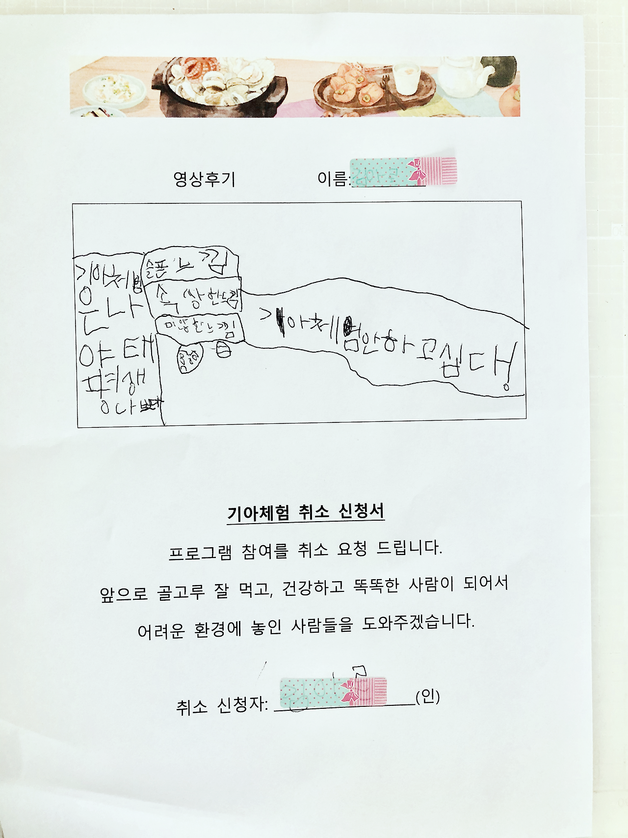 영상을 다 보고 난 아이가 책상 밑으로 들어가 숨었다. 눈물도 찔끔찔끔... 그래서 아이에게 취소 신청도 가능하다며 울지 말라고 위로를 한 뒤, 취소 신청서를 내밀었다.