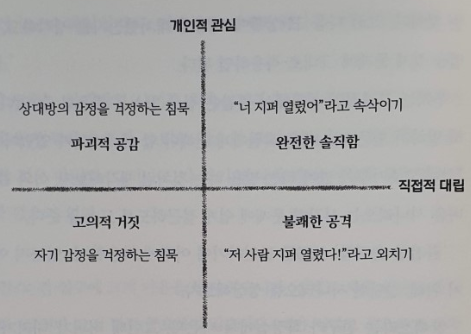 직원들과는 완전하게 솔직한 여성 관리자도 상사와는 불쾌한 공격 사분면에 머물러 있는 경우가 종종 있다. 물론 이러한 현상이 여성에게서 더 보편적으로 나타난다는 연구 결과는 아직 나오지 않았다. 그러나 내 경험상 그건 분명한 사실이다. (-> 여기까지 킴 스콧 책의 내용을 최대한 문자 그대로 정리한 것)