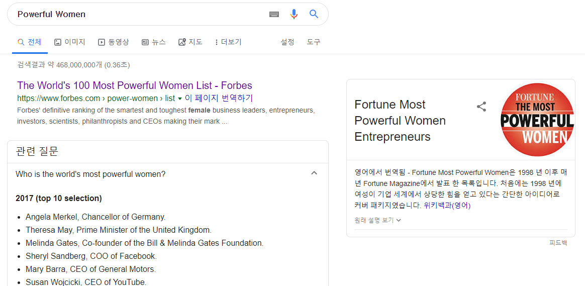 '쎈 여성'이라는 단어를 Powerful Women이라는 영어로 표현한다면 그 의미가 참 긍정적으로 들린다. 구글에 Powerful Women 을 검색하면 독일의 마르켈 총리, 영국 테레사 메이 총리, 페이스북 COO 셰릴 샌드버그, 유튜브 CEO 수잔 보이치키 등 멋진 여성들이 등장한다.