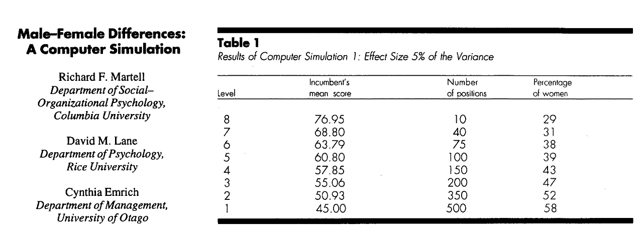 한 논문의 결과가 인상적이다. 연구원들은 시뮬레이션을 통해 성 편향이 평가 점수에 영향을 미칠 경우, 승진과 관련하여 장기적으로 어떤 결과가 나타나는지 실험해보았다. 성 편향이 성과 점수에 5퍼센트 영향을 미칠 때 초기에 여성이 차지하는 비중이 58퍼센트였던 조직에서 향후 여성 비율이 29퍼센트로 떨어진 것으로 드러났다. (*참고 논문 https://psycnet.apa.org/record/1996-02655-011)