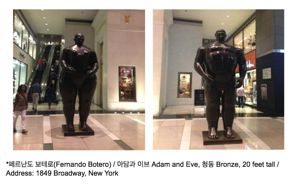 1492년 미국 신대륙을 발견한 크리스토퍼 콜럼버스의 동상이 광장 중앙에 높다랗게 서있고 그 아래에는 콜럼버스가 이끌던 니나호, 핀타호, 산타마리아호의 뱃머리가 조각되어 있다. 많은 뉴요커들과 관광객들의 약속 장소로도 유명한 이곳. 건물 3개 층이 연결된 투명 유리창으로 햇살을 듬뿍 머금은 타임워너 빌딩 로비의 양쪽 엘리베이터 앞에 나를 웃음 짓게 하는 한 쌍의 커플. 그 커플은 페르난도 보테로(Fernando Botero, 1932~)의 <아담과 이브>라는 대형 청동 조각 작품이다.