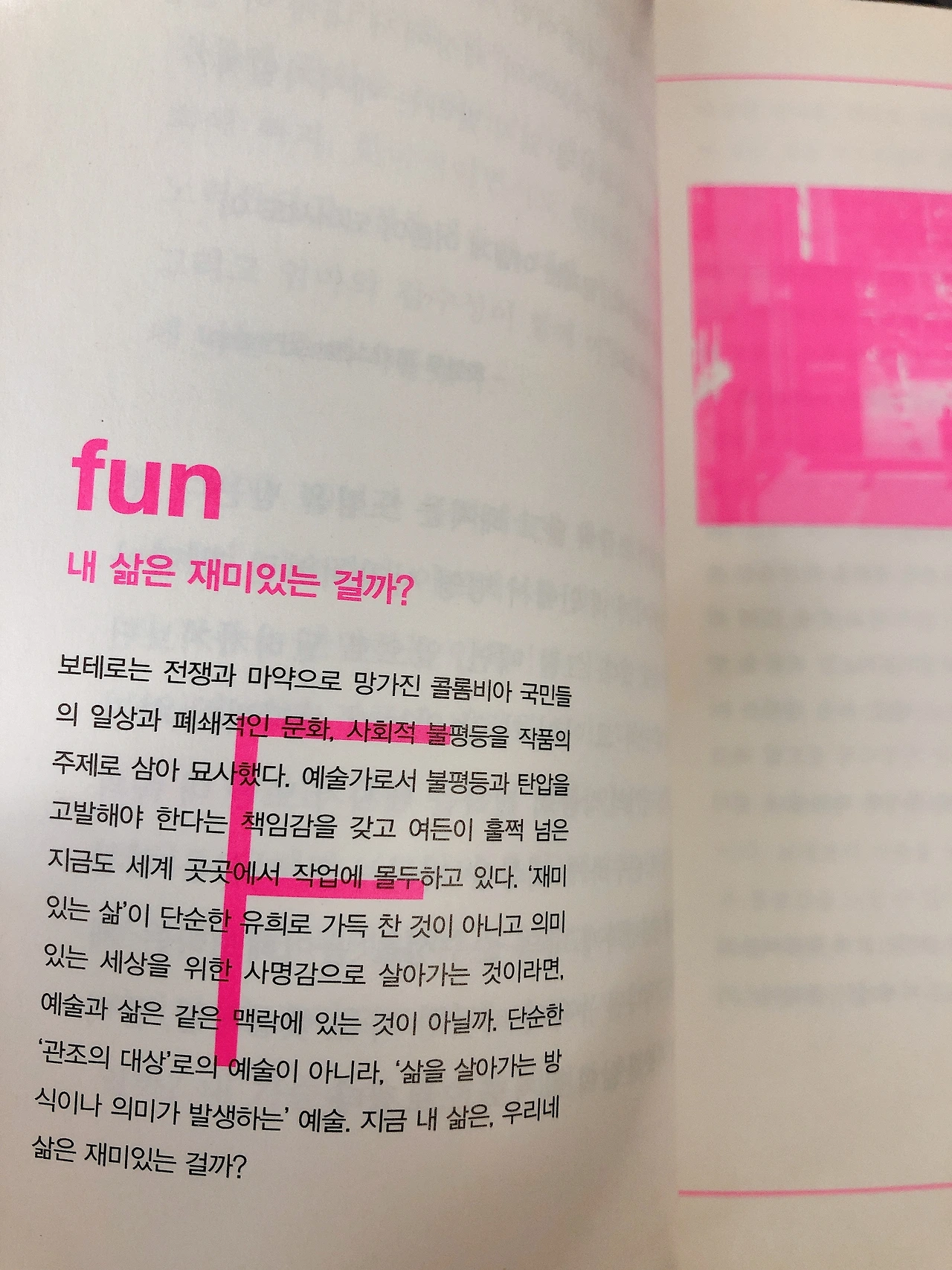 ‘재미있는’ 삶이 단순한 유희로 가득 찬 것이 아니라 무언가 의미가 있고 세상을 위한 사명감으로 살아갈 때라고 한다면 예술도 ‘삶’과 같은 맥락은 아닐까. 한 갓 ‘미적 관조의 대상’이 예술이 아니라, ‘삶을 살아가는 방식이나 의미가 발생하는 것’이 예술이라는 생각으로 작품을 보니 재미있고, 감사하다는 각이 들었다.