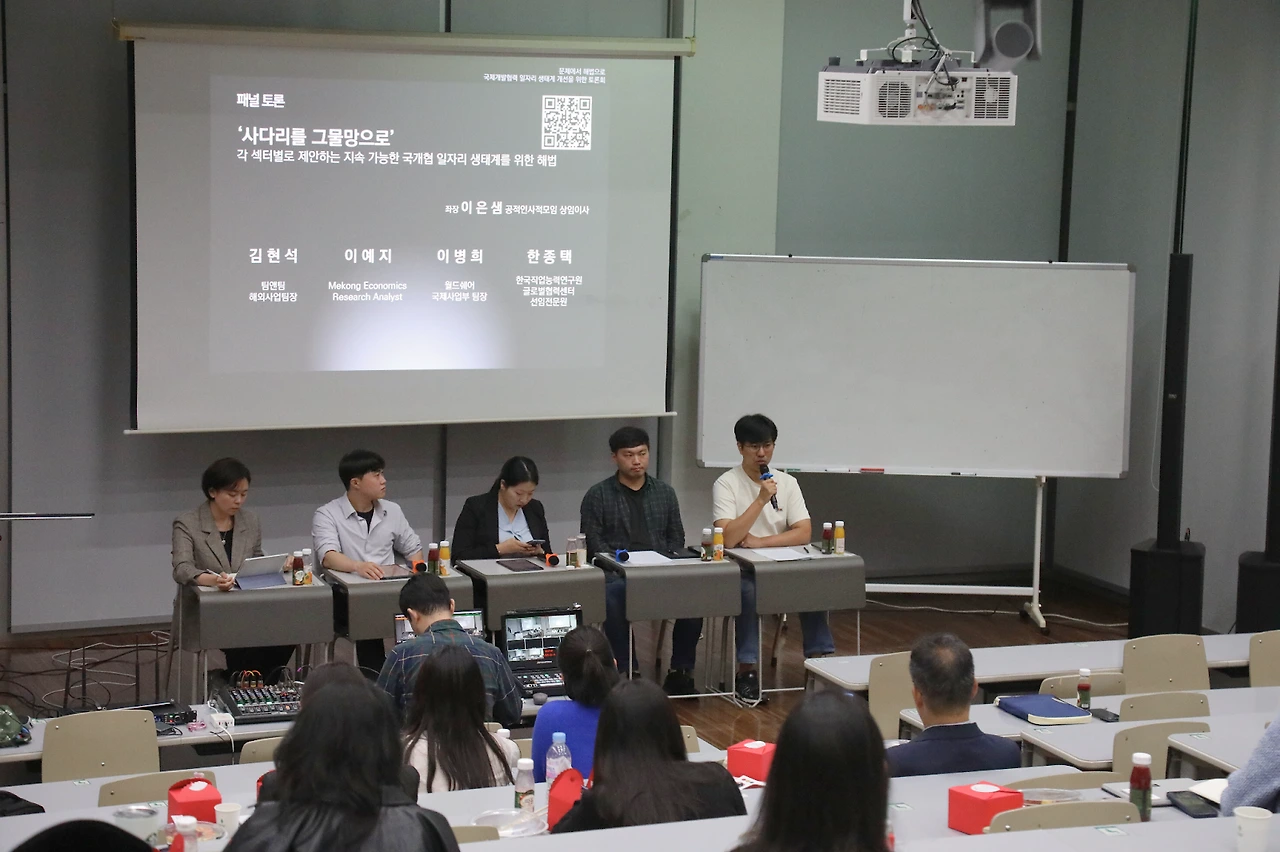 이러한 문제의식을 바탕으로, 지난 5월 16일 금요일 저녁 6시 30분 서울 이화여자대학교 ECC관 B146호에서는 ‘국제개발협력 일자리 생태계 개선’을 주제로 한 라운드테이블이 열렸다. 이번 행사는 국제개발협력 종사자 커뮤니티인 공적인사적모임(공사모)이 주최하고, 국제개발협력학회 개발협력 생태계 특별위원회가 주관했으며, 현장과 온라인을 합쳐 약 100여 명이 50명의 관계자가 참여했다.