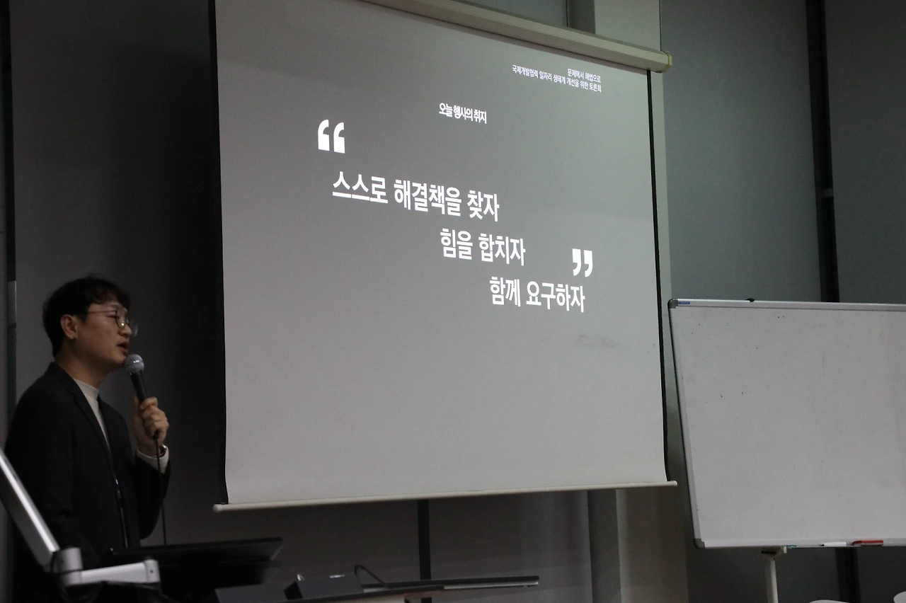 월드쉐어 국제사업부의 이병희 팀장은 국제개발협력 현장에서 실무자로 일하며 노동조합을 설립한 경험을 공유했다. 그는 “국제개발협력 종사자도 헌법이 보장한 노동자”라며, 자신의 조직에서 겪은 부당 해고와 노조 설립 과정을 소개했다. 특히 국제개발협력 조직의 재원 대부분이 시민들의 후원금, 그리고 공적개발원조(ODA) 사업의 경우 국민의 세금으로 운영된다는 점 때문에, 노동권을 주장하는 것이 ‘이기적인 행동’으로 비춰지는 사회적 시선이 가장 큰 걸림돌이었다고 설명했다.