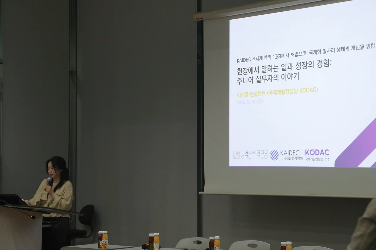 이어 국제개발컨설팅 KODAC의 이지윤 컨설턴트가 발제에 나서, 좋은 조직문화를 통해 성장한 초급 전문가의 일대기를 중심으로 좋은 조직문화를 통해 성장한 초급 전문가의 일대기를 중심으로 실무자 관점에서 체감하는 일자리 문제의 맥락을 공유했다. 이 컨설턴트는 지속가능하지 않는 국제개발협력 일자리 구조, 불안정한 고용 조건 등을 짚으며, “종사자들이 소모되지 않고 신체적, 정신적, 경제적으로 안정되고, 지속적으로 성장할 수 있는 구조"가 필요하다고 말했다.