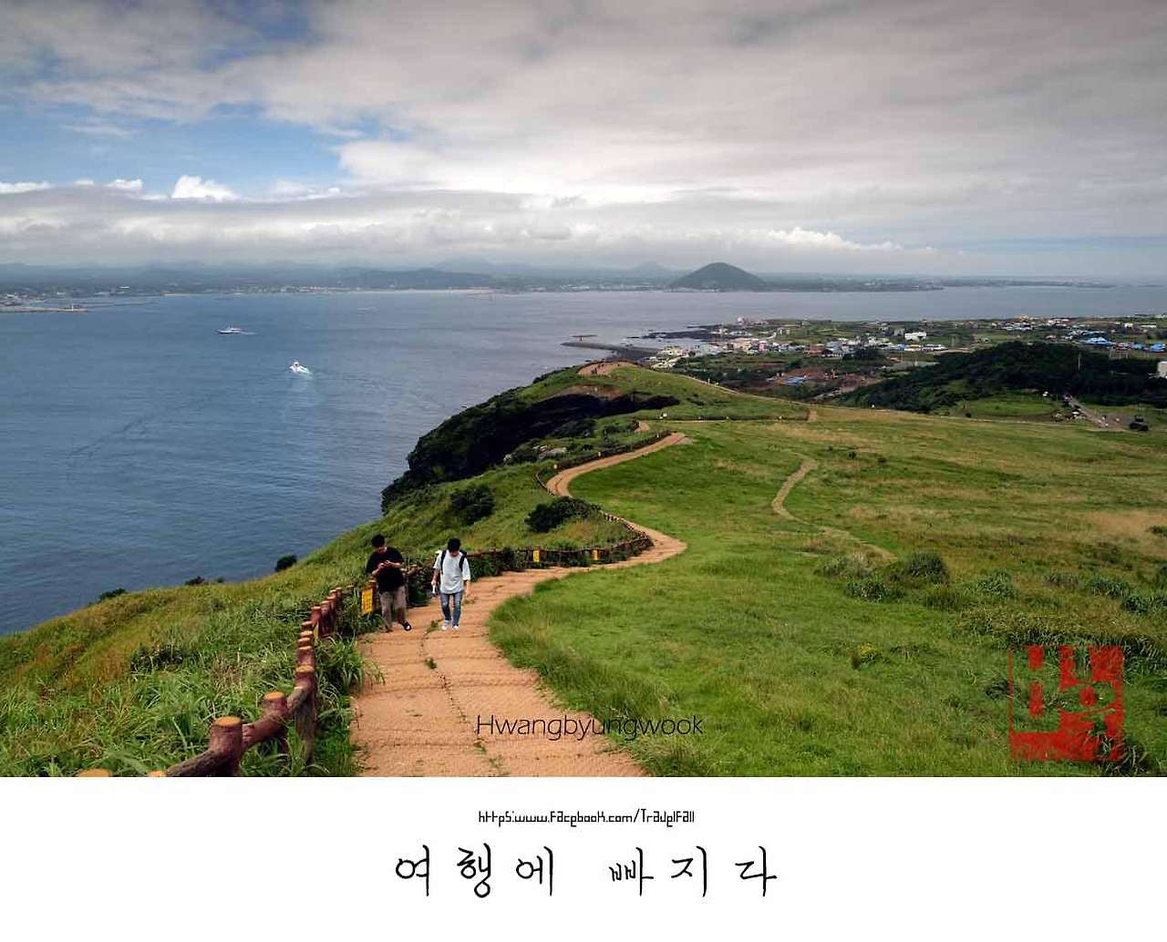 악동뮤지션의 "사람이란 게" 의 노래 가사처럼 갈길이 바빴던 난 팔은 팔대로 다리는 다리대로 앞뒤로 바삐 움직여야 했다. 겨우 오름의 산등성이를 넘어가는 찰나, 그냥 지나치기에는 너무 아름다운 자연을 바라보고 있자니 하나의 욕심이 더 생겼다. 코앞의 성산 일출봉, 동쪽의 지붕이라 할 지미봉까지 섬속의 섬에서 바라보는 섬이 주는 새로운 감각이 자각되는 순간이다.