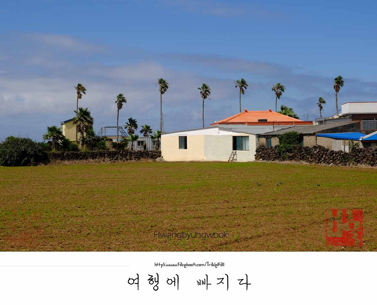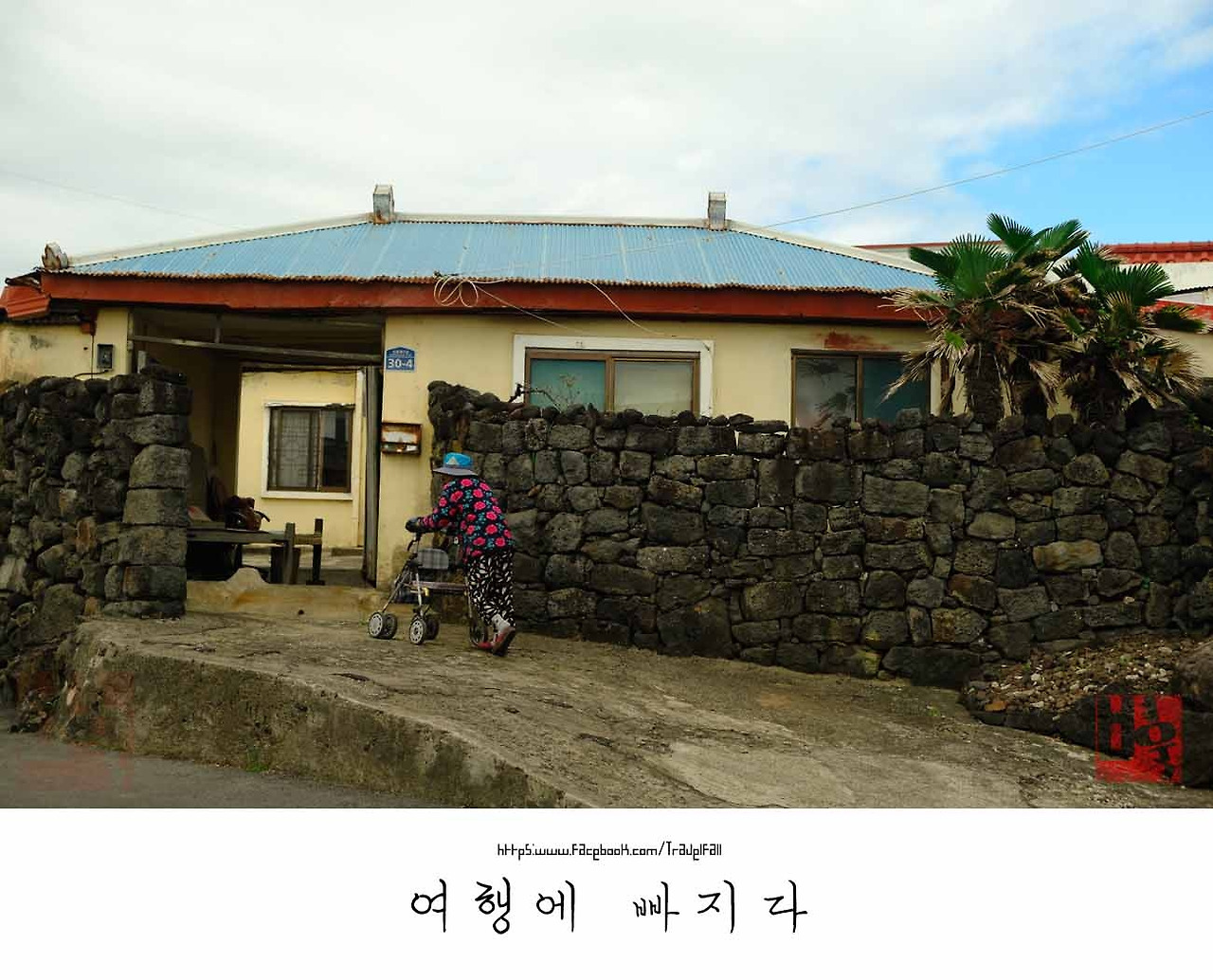 여기는 조천읍 신촌 마을. 제2의 추격전이 시작되었다는 빨간불이 켜졌다. 표적은 느릿느릿 거북이걸음 꽃무늬 티셔츠를 입은 할머니가 주인공이다. 나의 목적은 할머니를 모델로 만드는 것. 거북이가 아닌 달팽이로 할머니의 한 발짝 움직일 때마다 2초나 걸렸다. 아직 가야 할 거리는 3km 남짓이다. 난 신촌리를 빠져나갈 때까지만 달팽이가 되기로 했다. 그런 와중에 이쁜 집을 하나 발견한다. 돌담으로 둘러싸인 파란 지붕과 마당 한쪽의 야자수에 발목을 잡혔다. 사정없이 집을 담는다. 슬금슬금 뒤늦게 꽃무늬 티셔츠 할머니가 나타났다. 등골이 오싹해 온다. 할머니가 가는 집 바로 내가 죽자고 찍던 집이다. 깝죽거리면 찍기에 바빴던 난 움찔. 난 그 순간을 모면하려고 딴청을 피웠다. 간담이 작은 난 돌아올 할머니의 억센 말투에 지레 겁이 났다. 꽁무니를 감추고 줄행랑을 치기 바빴다. ‘할머니 건강하세요.’