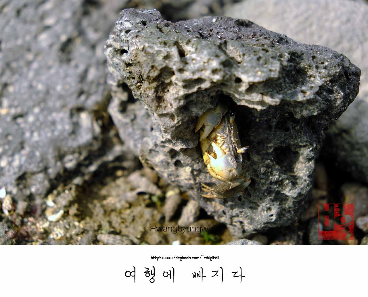 1km 남짓, 북촌 포구에 닿기 전 정자가 바람을 쐬었다. 올레길 위 아저씨, 아줌마의 쉼터다. 그 옆 환해장성 앞 물 빠진 작은 웅덩이가 소란스럽다. 그냥 지나칠 수 없는 노릇이다. 목을 쭉 빼고 눈을 부릅뜨고 바라봤다. 물 빠진 웅덩이는 구멍이 숭숭 뚫렸고 바닥을 뛰어가는 게가 천지삐까리다. 게가 먹이를 찾느라 분주하게 움직였다. 게는 3cm부터 7cm까지 크기도 모습도 다양하다. 가까이서 보려고 난간을 폴짝 뛰어내렸다. ‘쿵’ 하는 발소리에 놀란 게가 야단법석이다. 지진이라도 일어난 듯 돌 밑으로 숨고 집으로 도망을 가고 정신이 없었다. 그중 제법 큰 녀석을 발견하고 다가갔지만 발걸음에 겁을 먹고 돌 밑으로 숨기 바쁘다. 살짝 돌을 들쳤다. 옆으로 쏜살같이 뛰어간다. 100m의 영웅 "우사인 볼트"만큼 재빠르다. 옆으로 뛰기 올림픽 종목이 있다면 금메달을 땃을 정도다. 그렇게 도망친 게는 바보처럼 또다시 돌 밑으로 숨어들었다. 역시 나 또한 돌을 다시 들쳤다. ‘으하하’ 웃음을 참을 수 없다. 좁은 돌구멍이 집인 것처럼 들키지 않으려고 돌에 납작 붙어 꼼짝을 하지 않는 게. 툭 튀어나온 두 개의 눈만 요리조리 움지락거린다. "넌 커다란 내가 보이겠지." 집게발을 툭툭 건드려 보지만 도망칠 기미가 없다. 게는 그저 돌과 한몸처럼 "난 절대 찾지 못 할 거야! 잘 숨었어. 만사 OK" 자신만만히 숨어있는 모양이다.