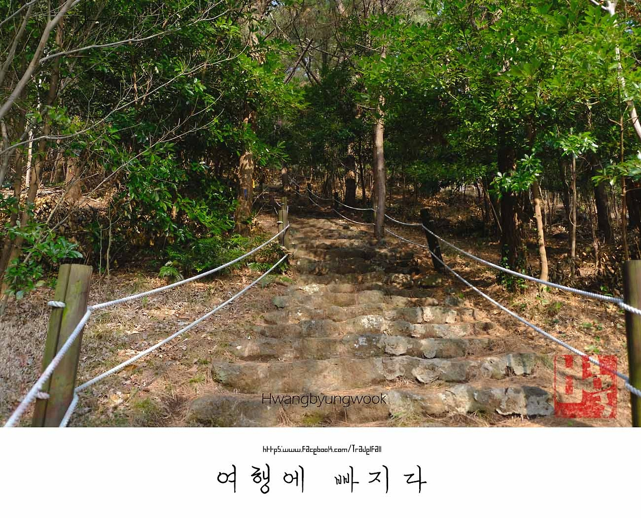 “시작이 반이다.”라는 속담은 어디로 사라진 걸까. 보기에도 숨이 턱 막히는 경사가 가로막았다. 하나, 둘, 셋… 60개쯤 되는 계단길이 뻗어있다. 처음부터 힘을 뺄 생각도 없었지만 다행히 계단의 끝도 눈에 보였다. 여정에 있어 올레 길이든 오름이던 쉬엄쉬엄 걷누 게 원칙을 가진 나였다. 조용히 불어오는 찬 바람의 공기를 깨고 함께 걷는 동지에게 말을 건넸다.