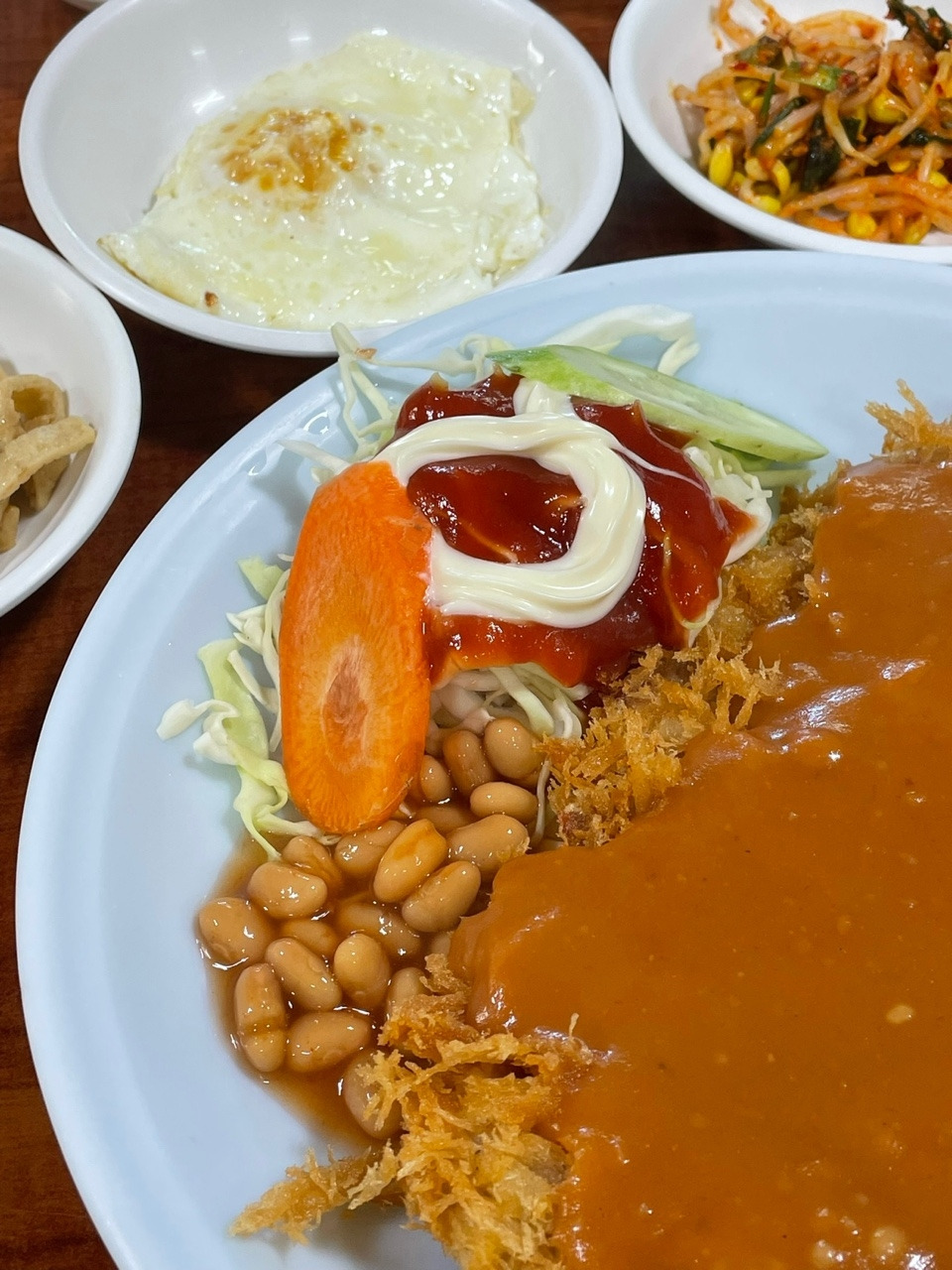 돈가스가 나왔다. 밝고 노란 튀김옷에 빵가루 입자들이 큼직큼직하다. 첫 입에 파삭하고 씹히는 튀김옷이 좋았고, 물리적 연육을 거친 고기는 부드럽게 씹히면서 밑간이 잘 배어 있었다. 역시 즉석에서 만들어서 그런지 돈가스 본연의 매력이 잘 드러난다. 경양식의 근본이라 할 수 있는 케요네즈 양배추 샐러드까지 좋았던. 백반집인 만큼 기본 반찬이 다섯 가지가 나오고, 공깃밥과 국물, 거기에 프라이까지 챙겨주신다. 든든한 집밥을 먹는 기분.