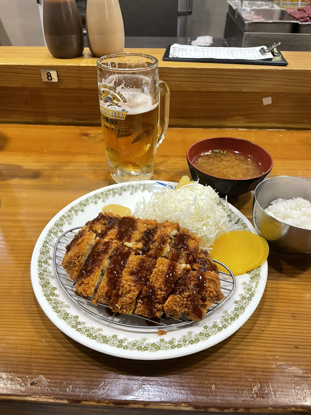 사진을 한 장 찍고 나서 돈가스 소스를 돈가스 위로 지그재그로 뿌리는데, 특별한 의미는 없고 그냥 늘 해왔던 루틴 같은 거랄까. 좀 더 먹음직스럽달까. 그다음은 알싸한 겨자를 콕 찍어 같이 먹는데 이게 은근 중독적인 매력이 있다. 절반쯤 먹었을 땐 타바스코 핫소스를 달라고 한다. 사실 보통 코돈부루를 시키면 같이 내어주는데 요즘은 따로 말씀을 드려야 주신다. 그냥 먹어도 맛있긴 한데 약간 피자 토핑 같은 맛이 핫소스를 뿌리면 은근 잘 어울린다. 돈가스를 다 먹으면 남은 꼬치에 끼어진 파인애플 세 조각으로 입가심을 하고 식사를 마친다.