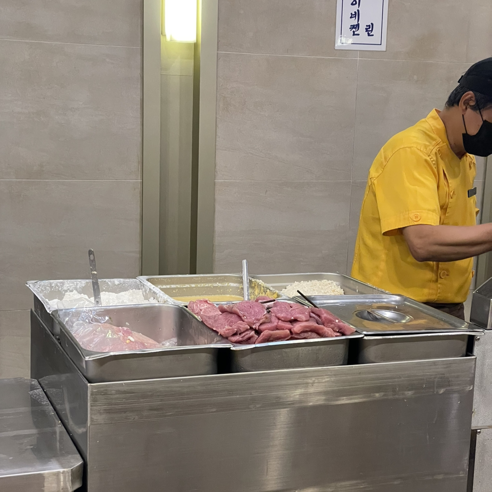 명동돈가스는 3층이지만 모든 돈가스는 1층 주방에서 튀겨주기 때문에 다찌석에 앉으면 돈가스 튀기는 과정을 지켜볼 수 있어 기다리는 게 심심하지 않다. 주문과 동시에 준비된 고기에 밀가루, 계란물, 빵가루를 차례대로 묻히고 튀김기에 풍덩 집어넣는다. 굉장히 단순한 과정이지만 이 또한 꽤나 단련된 주방장이 다루고 있다.