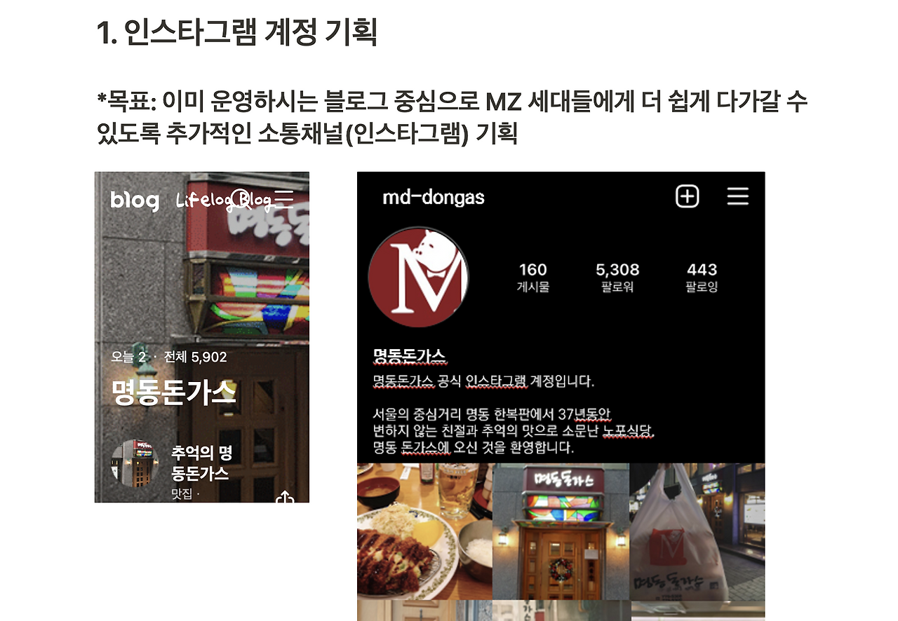 2년 전 명동돈가스에 가게 인스타그램 계정을 직접 운영해보고 싶다는 메일을 썼다. 명동돈가스에서 유일하게 블로그만 운영하고 있다는 게 첫 번째 이유였고, 코로나19로 명동에 사람들의 발길이 끊겼을 때 많은 사람들에게 알리고 싶다는 팬심이 두 번째 이유였다. 내가 가지고 있던 인사이트 수치와 인스타 계정 운영 방향성을 간략하게 적어서 메일을 보냈다. 그 당시 연락하고 지냈던 인플루언서 분과 한 시간 만에 얘기 나누고 후다닥 써서 낸 거라 솔직히 몇 십년 간 쌓아온 내 팬심이 너무 가벼워 보이지는 않을까 걱정도 많았다. 이런 방식보다는 좀 더 진지하게 제안을 하고 싶었지만 솔직히 당시에 그런 추진력이 없었더라면 지금도 머릿속에만 담아두고 있지 않았을까라는 생각도 들었다.