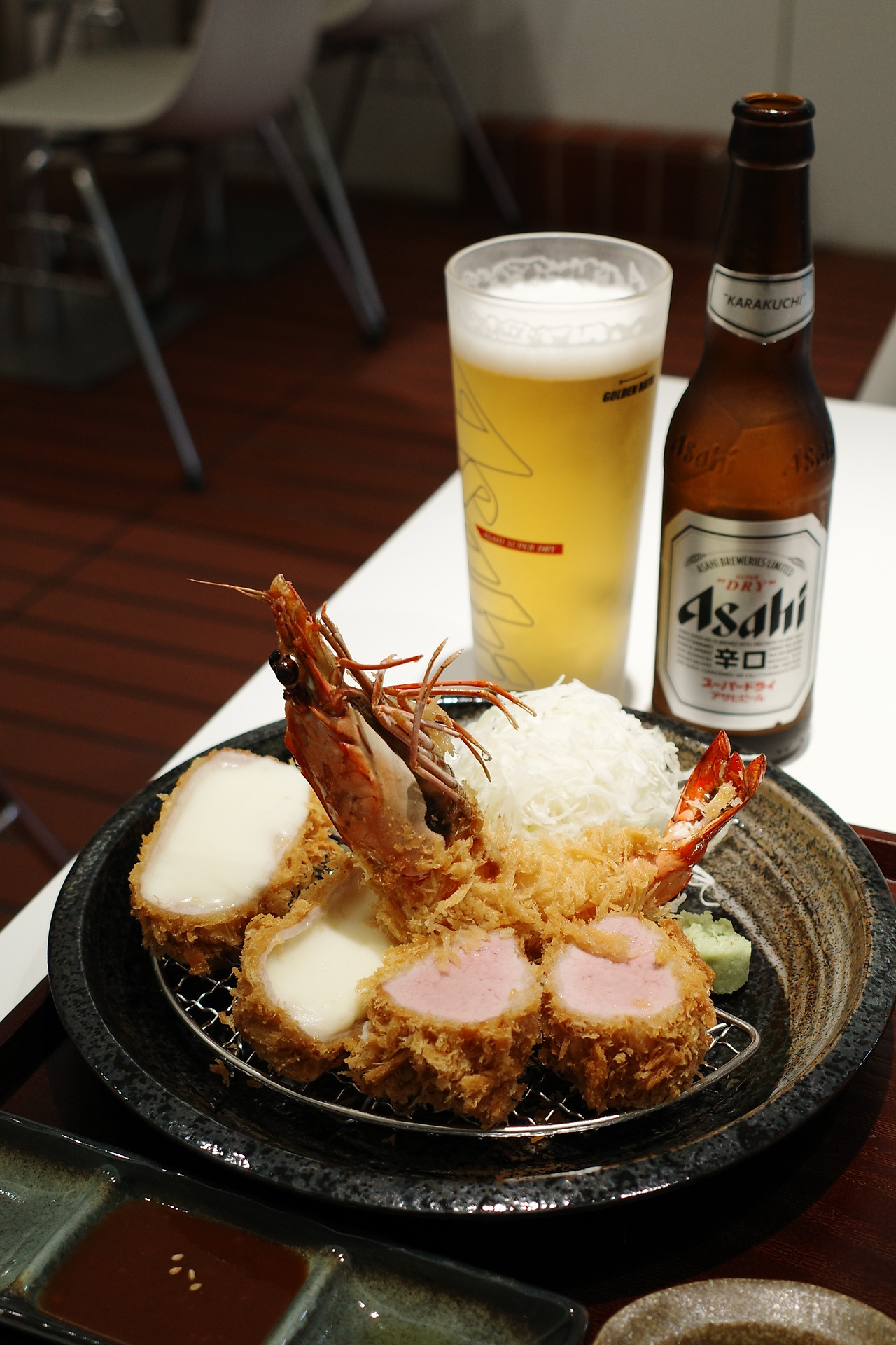 기분 좋은 고소한 튀김냄새에 취해 맥주 한 병도 시켰다. 아사히 맥주병을 배경 삼으니 정말 일본 현지에 온 듯한 기분이다.