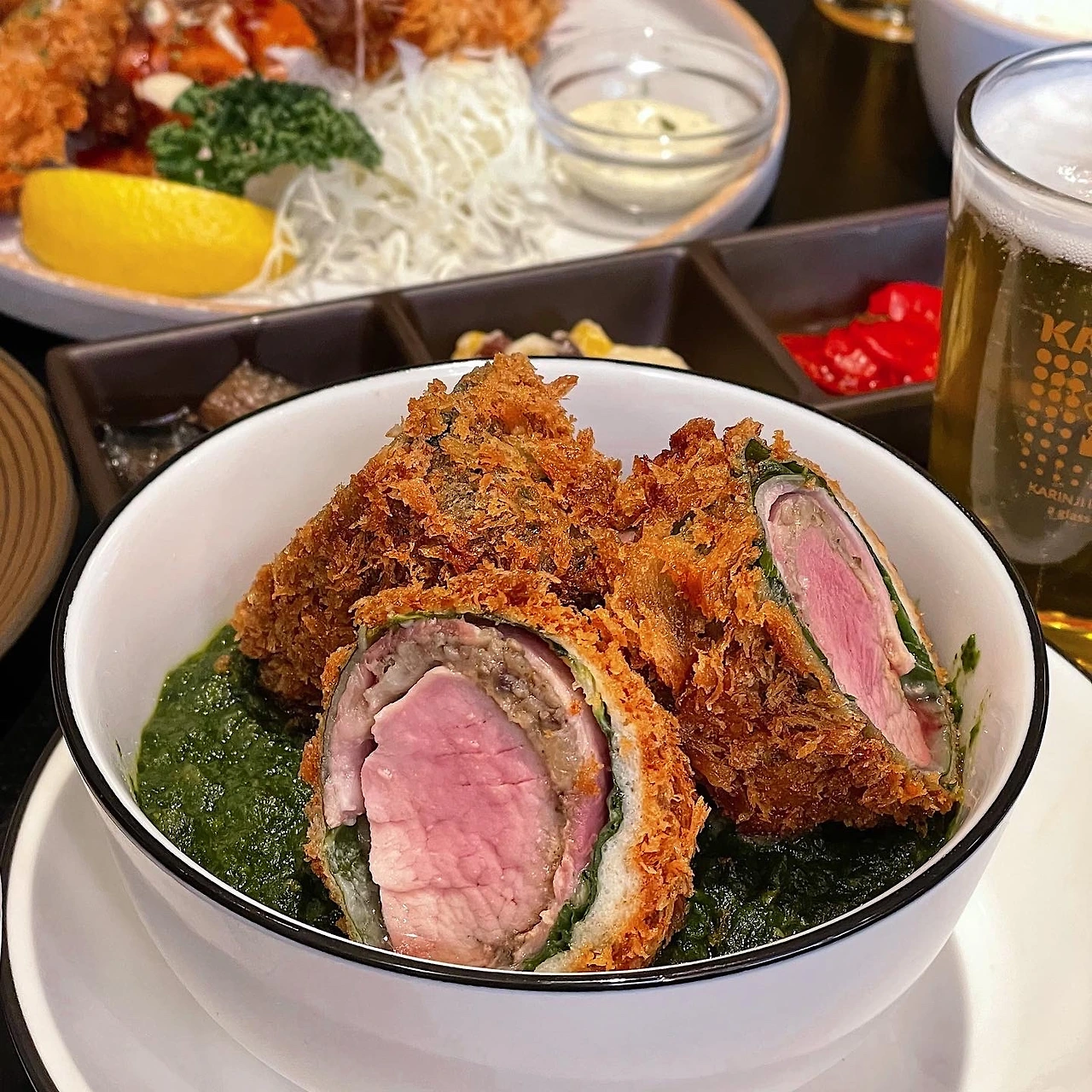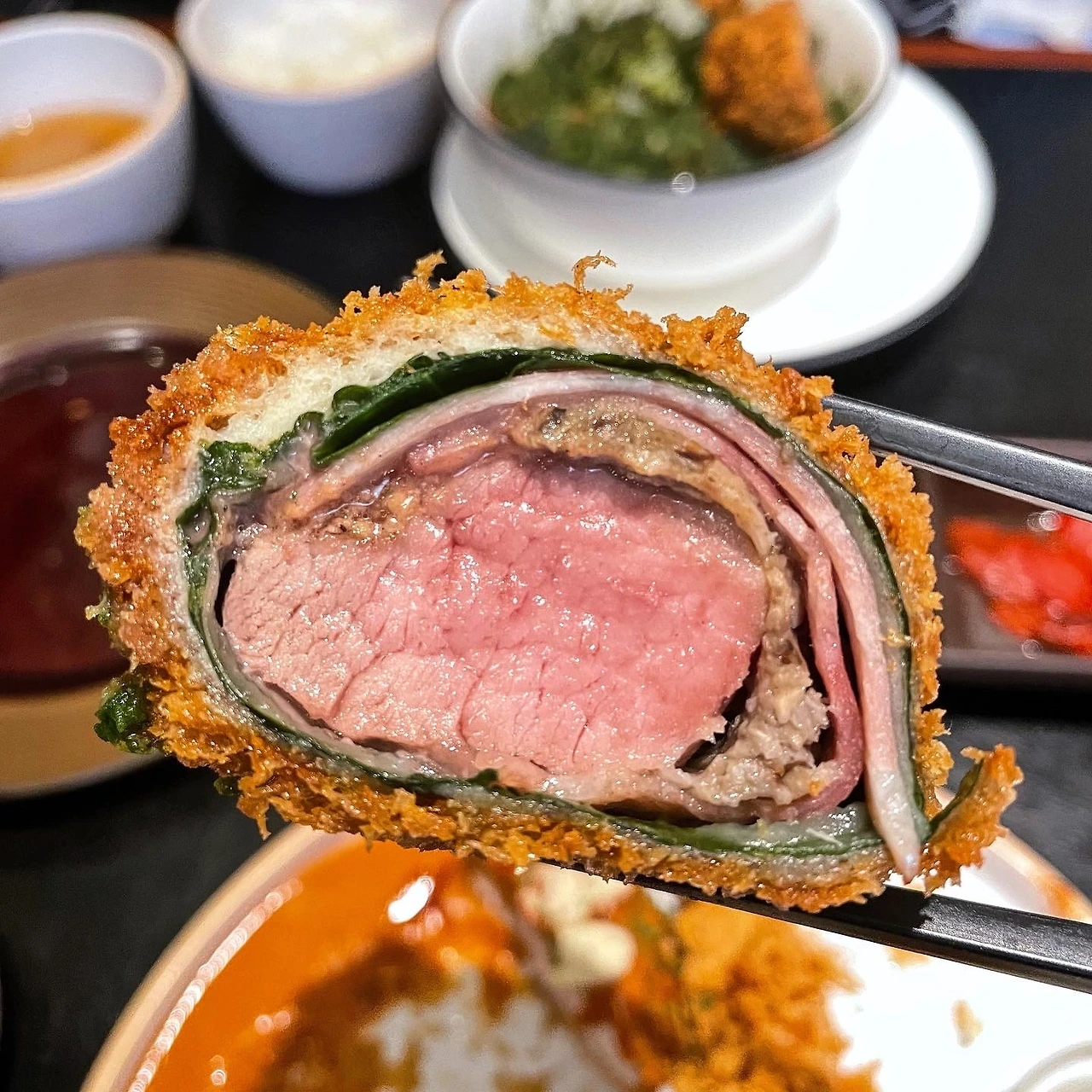 시그니처 메뉴라 할 수 있는 시금치카츠카레 비주얼이 가장 압도적이다. 가운데 안심에서 흘러나온 육즙이 싸악 고여있고, 조명 빛에 더 영롱하게 빛난다. 비프 웰링턴을 표방했다 하는데, 이거다 싶었다. 카츠는 3가지 버섯, 베이컨 등으로 안심을 겹겹이 쌌고, 베이컨 향이 강하긴 했는데 씹을수록 재료 본연의 식감들이 잘 살아있는 게 느껴진다. 튀김옷을 굉장히 얇게, 바삭한 식감만 잘 살렸고, 흘러나온 육즙이나 카레 위에 얹어졌음에도 눅눅해지는 게 없는 것을 보니 온도감을 잘 맞췄나 보다.