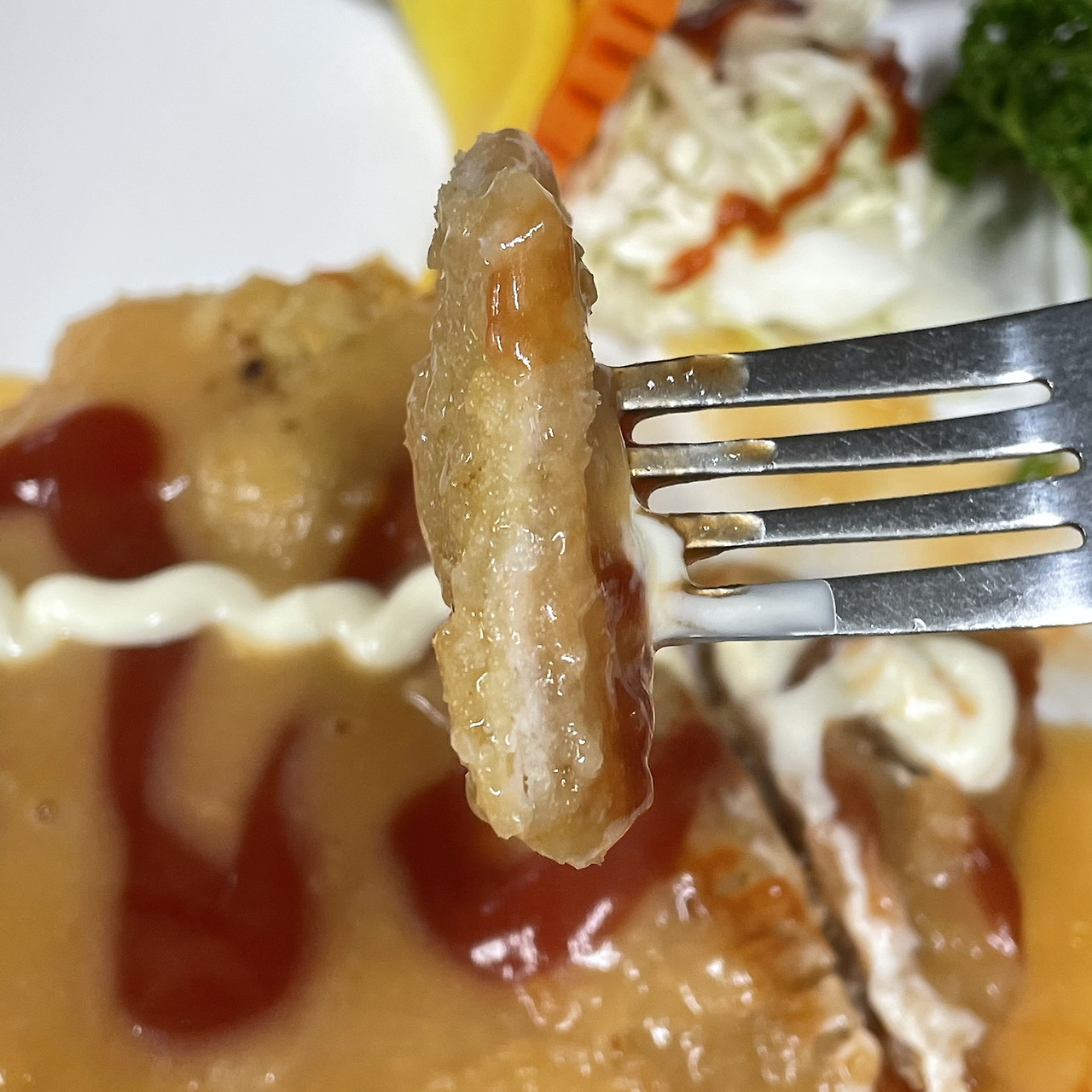 돈가스가 나왔다. 생각보다 양이 작긴 하다. 그래도 밥이랑 반찬 곁들어 1인분으로 먹기에는 나쁘지 않은 듯. 소스는 어떤 걸 베이스로 만든 건지 모르겠는데 굉장히 밝고, 달달한 맛이 많이 난다. 무심하게 뿌려놓은 케요네즈가 더해져 약간 뻔하지만 익숙한 맛이라 좋았다. 얇은 튀김옷에 소스가 그득하게 스며들어있고, 입에서 쫙쫙 달라붙는다. 고기는 얇지만 적당하게 씹히는 편. 반찬 맛도 좋아 돈가스 먹으면서도 골고루 먹게 된다.